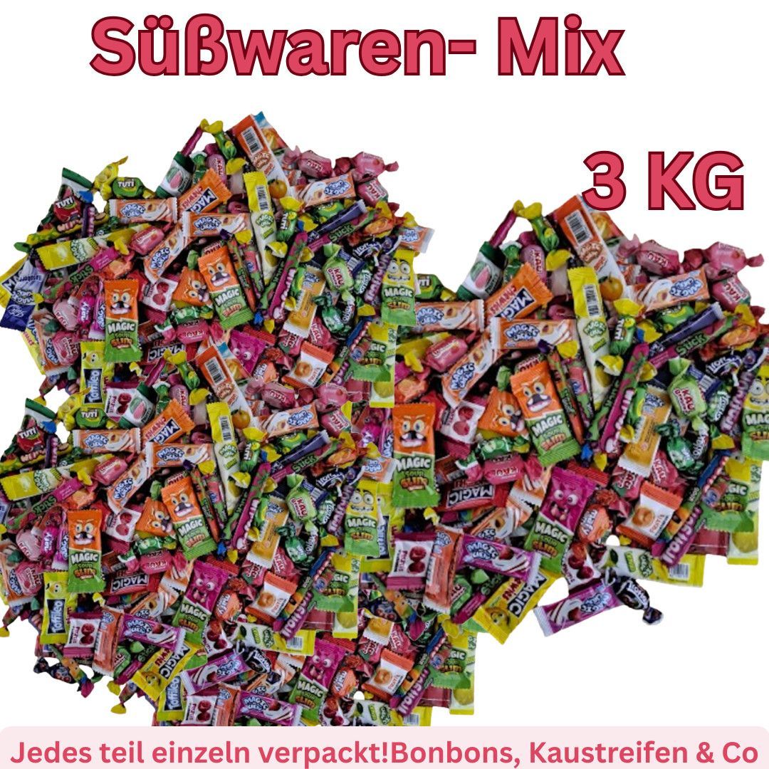 - XXL Packung – 3 Kilogramm bunte Süßigkeiten - Enthält Kaubonbons, Kaustreifen, Fruchtkaubonbons u.v.m. - deal für Feiern, Events, Mitgebsel, Giveaways & Wurfmaterial - Attraktive und hygienisch verpackte Einzelportionen - Für Großhändler, Vereine & Wiederverkäufer bestens geeignet