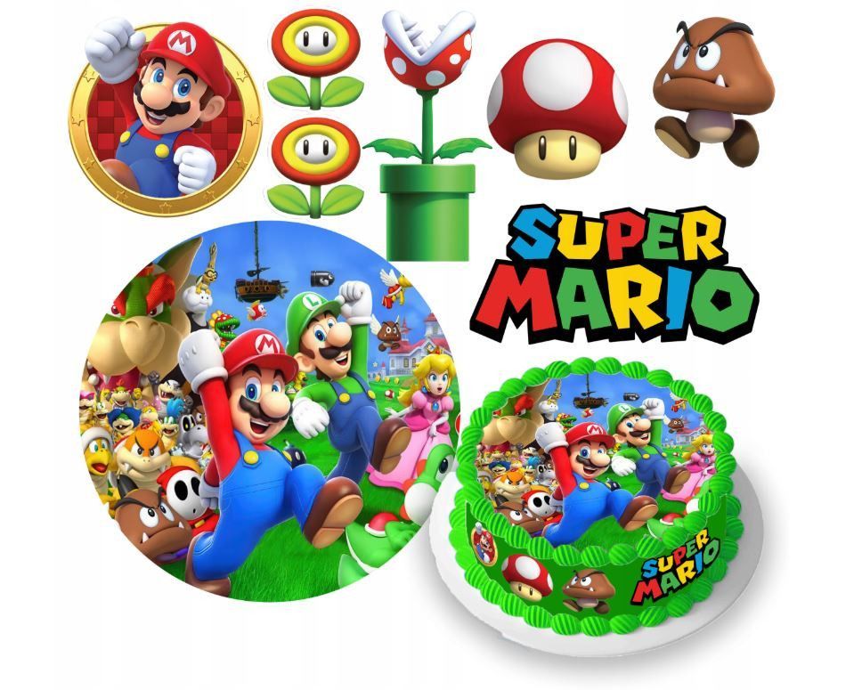 Super Mario Essbar Mario Bros Luigi Zuckermasse Tortenbild Tortenaufleger + 4 Muffin