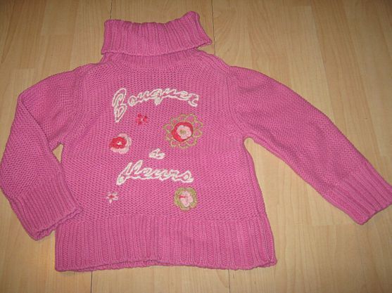 ist altsrosa, vorn mit Stickerei, mit Rollkragen, ist mit 104 angegeben, kann schon etwas eher getragen werden, die Arme lassen sie gut 1x umschlagen. Ist ine in einem guten bis sehr guten Zustand. Keine Flecken oder Löcher!! Wir sind ein tierloser Nichtraucherhaushalt! ...nun schaut einfach... . ..