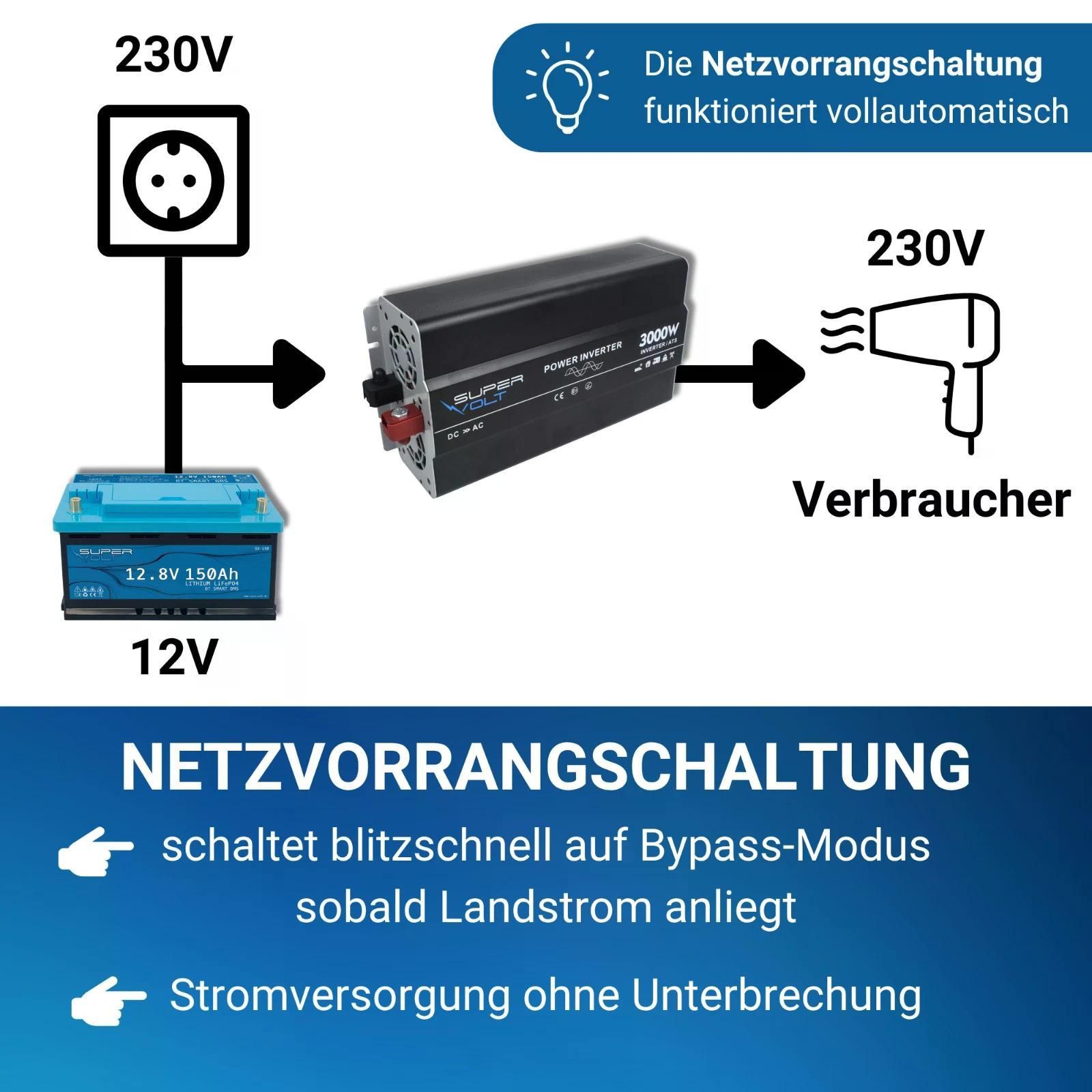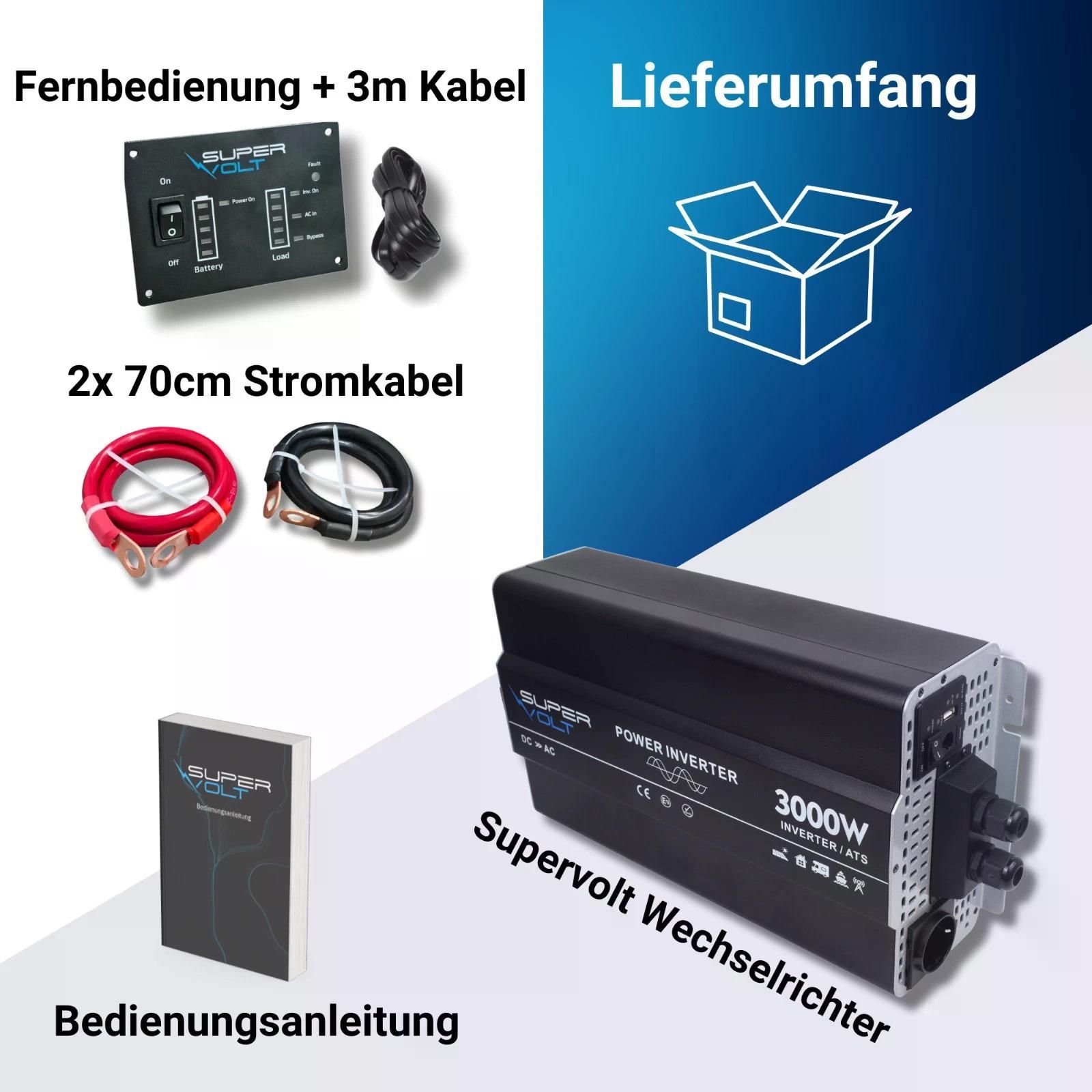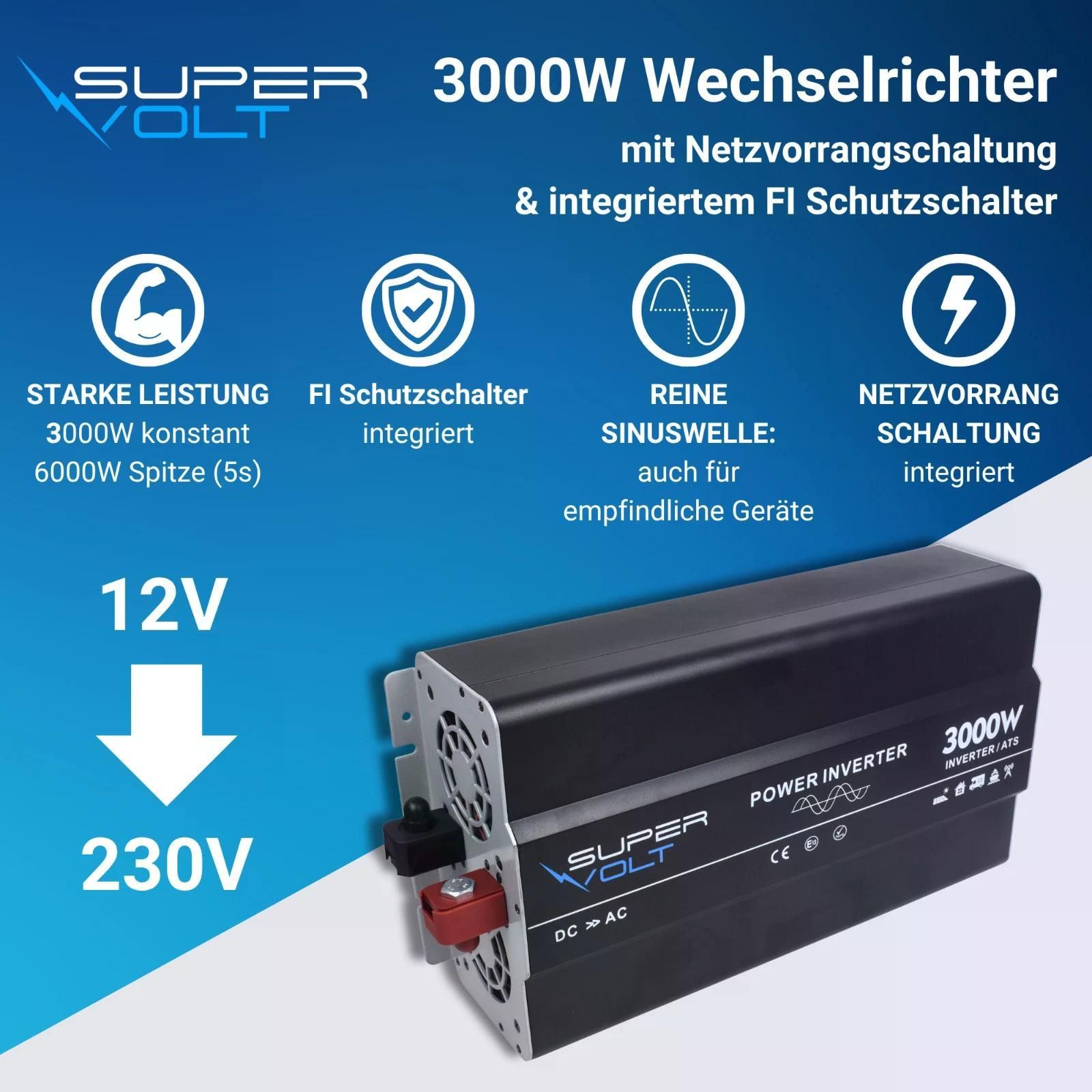 Supervolt 12V 3000W Wechselrichter – Reiner Sinus, Netzvorrang, Wohnmobil & Boot