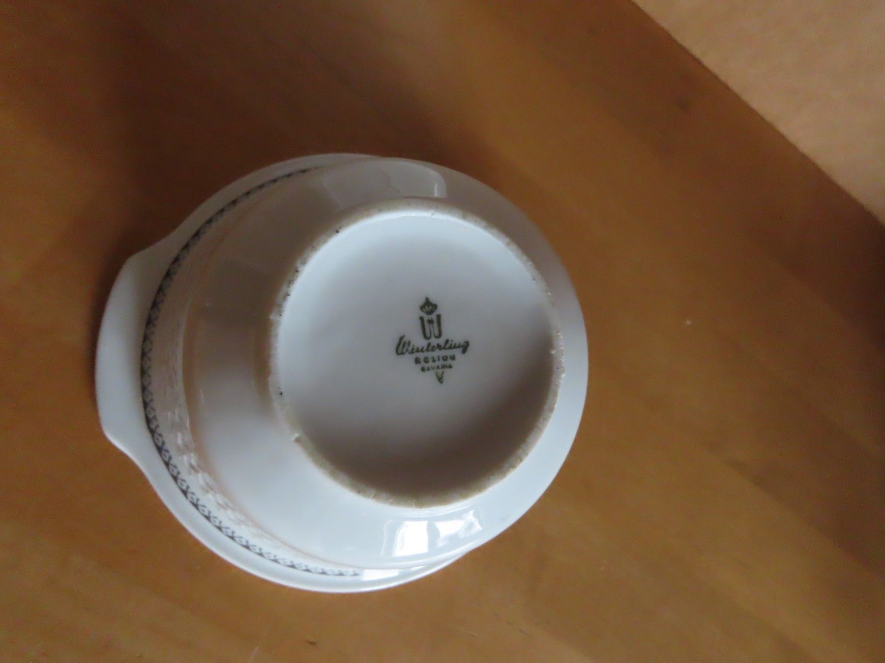 Maße: ca.12 cm Durchschitt und ca. 6,2 cm hoch ----immer die breiteste Stelle gemessen ohne Griffe gemessen der Standfuß hat einen Durchmesser von ca. 5,5 cm Material: Porzellan ist verschmutzt und die Goldauflage hat feinen Abrieb... Mehr