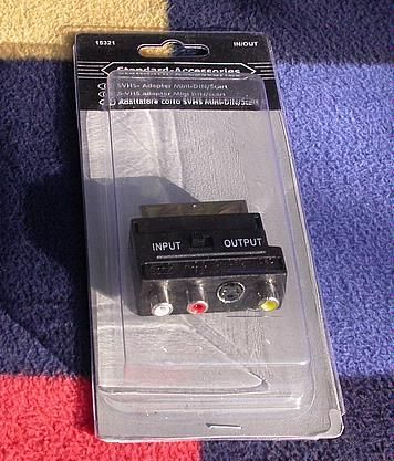 SVHS-Adapter Mini-DIN Scart IN OUT Der Adapter hat, im Bild vorne, von links nach rechts: - Eine Cinch-Buchse "AUDIO (L MONO)" - Eine Cinch-Buchse "AUDIO (R)" - Eine Mini-DIN-Buchse "S-VIDEO" - Eine Cinch-Buchse "VIDEO" Im Bild an der Rückseite ist ein Scart-S