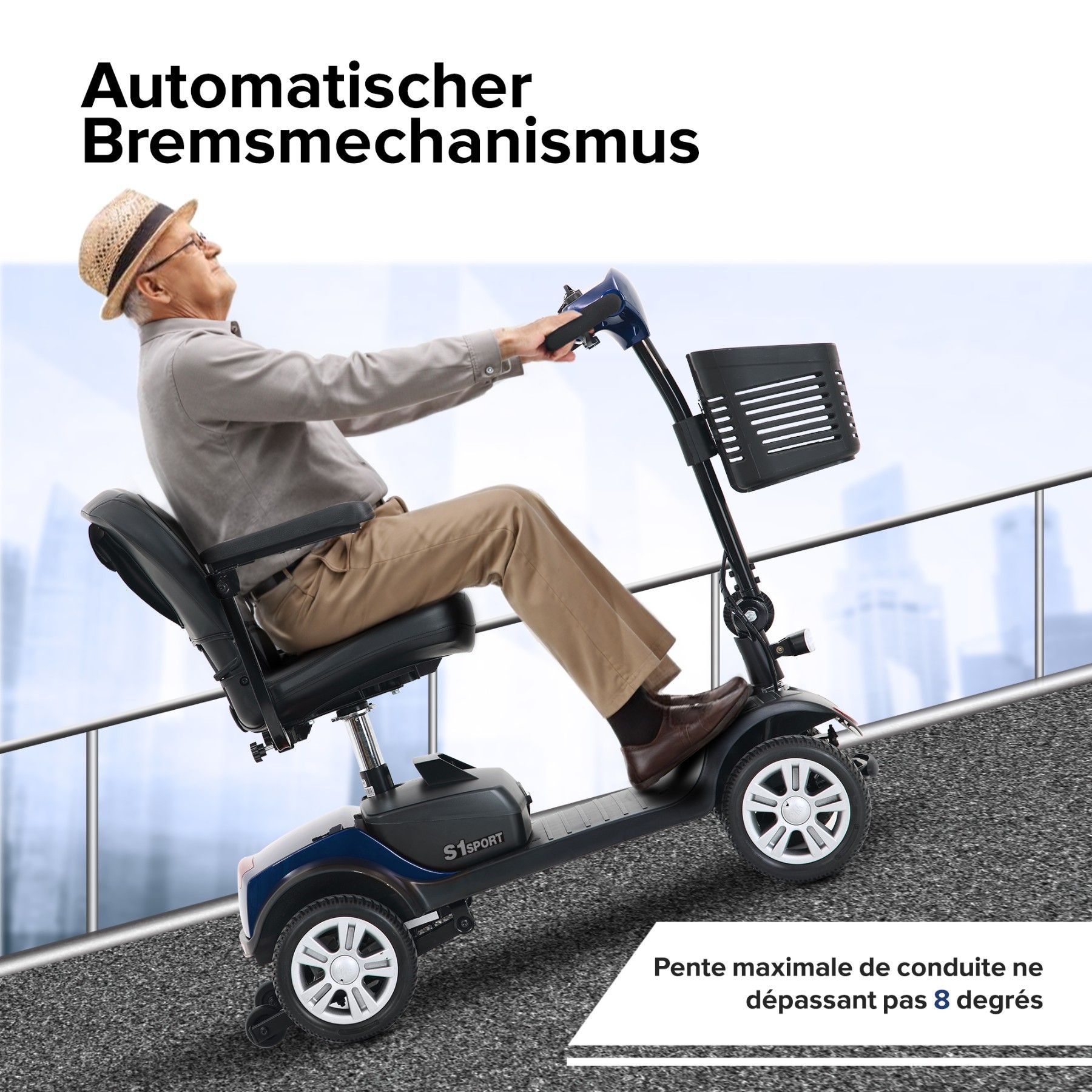 Dieser elektrische Scooter ist speziell für komfortables und sicheres Fahren konzipiert. Der 300W Motor bietet eine stabile und zuverlässige Leistung für den täglichen Einsatz mit einer Reichweite von bis zu 15 Kilometern . Die Höchstgeschwindigkeit von 6 km pro Stunde sorgt für kontrolliertes und s