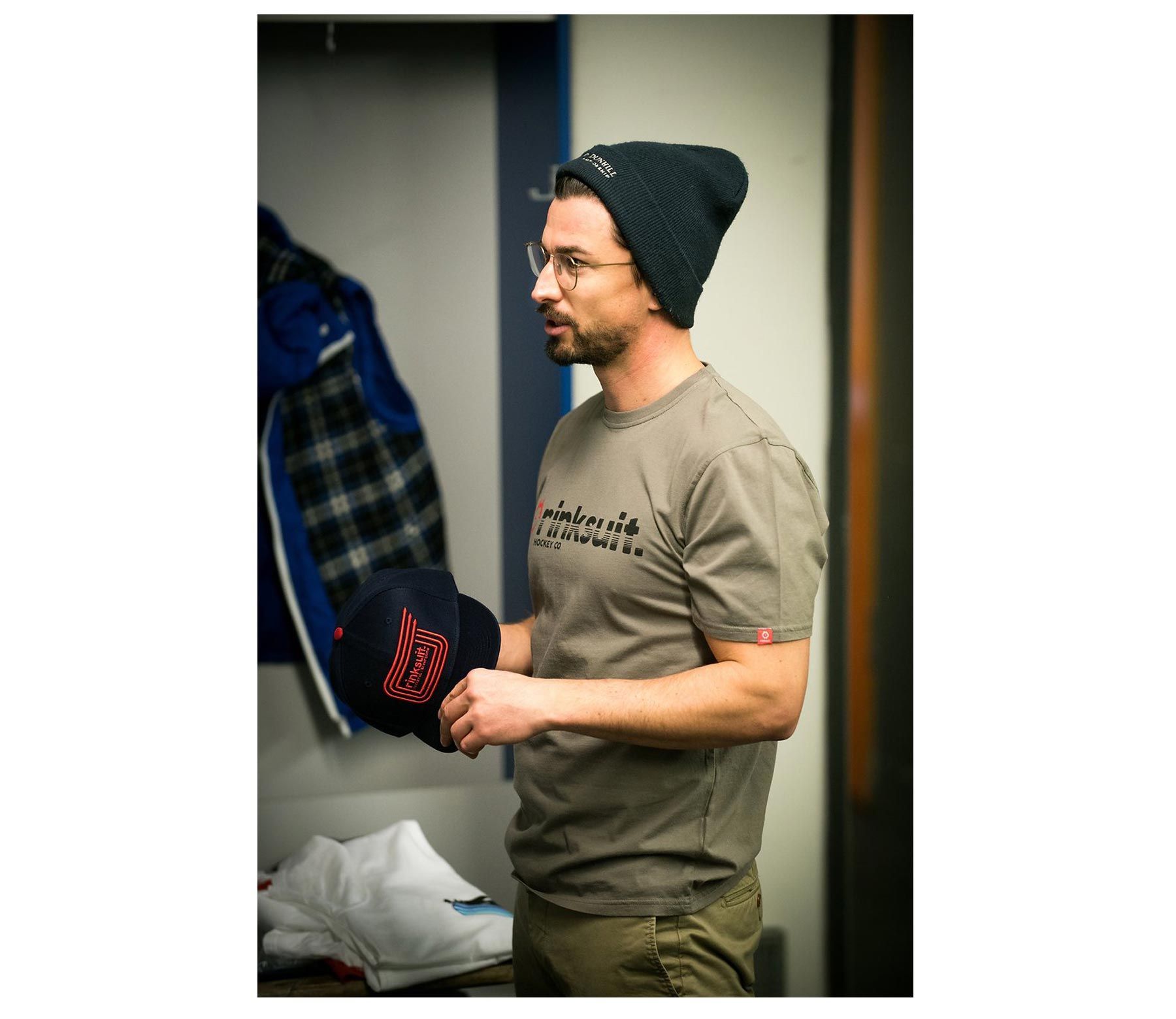 Der perfekte Begleiter für jede Lebenslage. Auf der Brust ist unser klassischer "rinksuit." und im Nacken unser "Holy-Rink"-Print zu sehen.