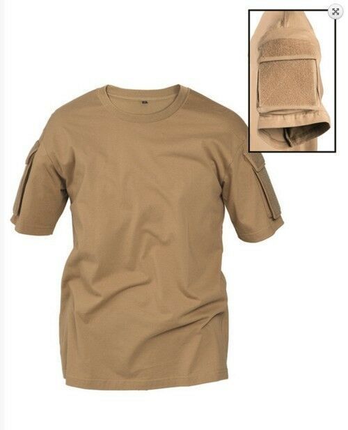 Tactical T-Shirt coyote Armyshirt mit Oberarmtaschen. Material: 100% Baumwolle. Farbe: coyote (khaki). Oberarmtaschen mit Klettflausch zum Anbringen von Hoheits- Rangabzeichen. Bitte wählen Sie die gewünschte Größe.