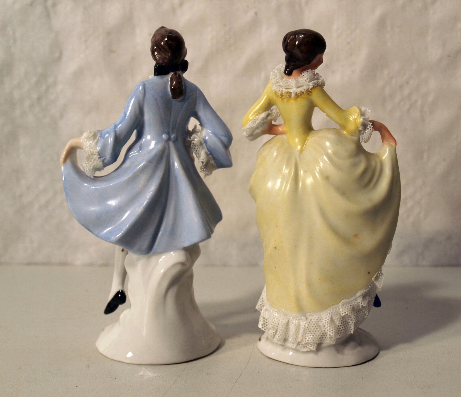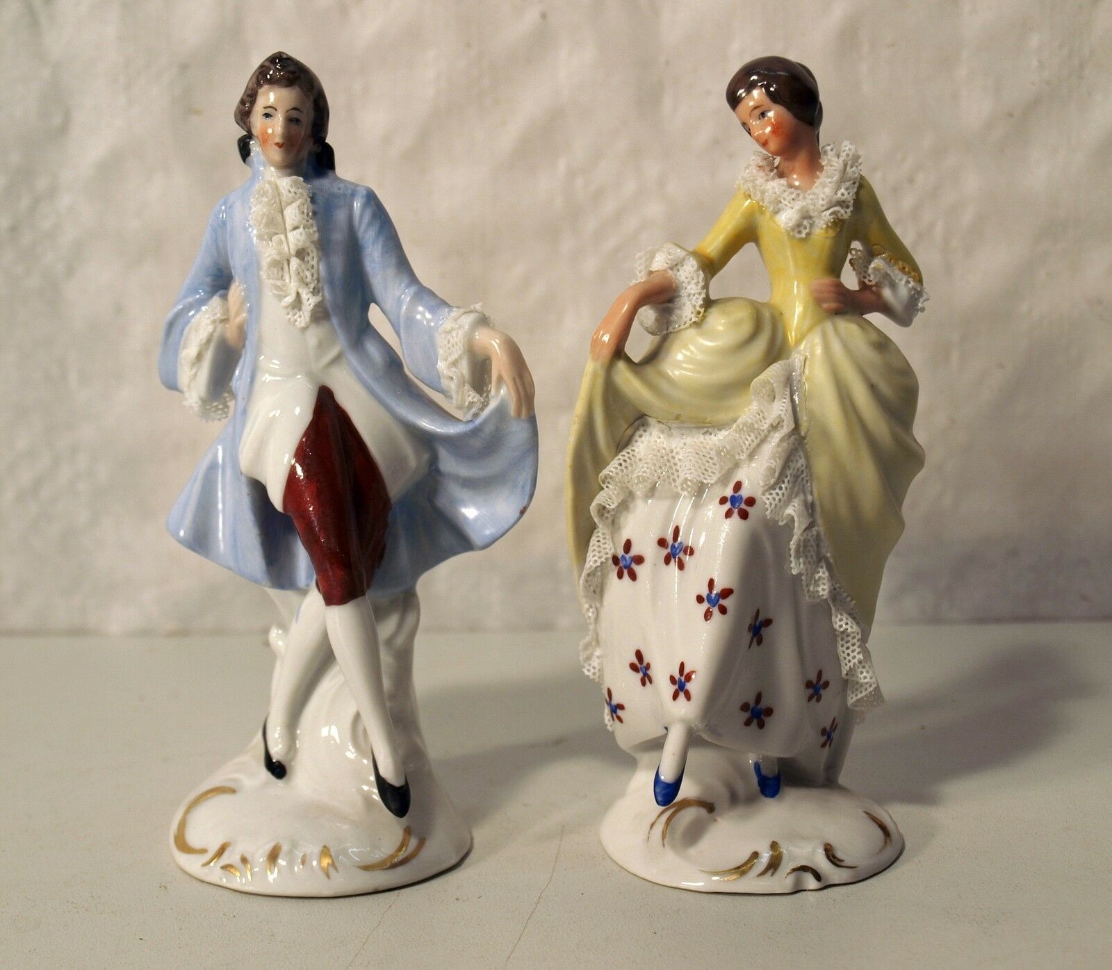 Zwei Porzellan-Figuren wohl um 1900. Marke: Germany 9742 9743 (siehe Foto). Tanzpaar im Rokoko-Stil. Einige wenige Rüschen sind verloren gegangen. Maße: Höhe 13 cm. Antikes am Deich - Inh: Oliver Kipp-Trense G M T Sprache erkennen Afrikaans Albanisch Arabisch Armenisch Aserbaidschanisch Baskisch Ben