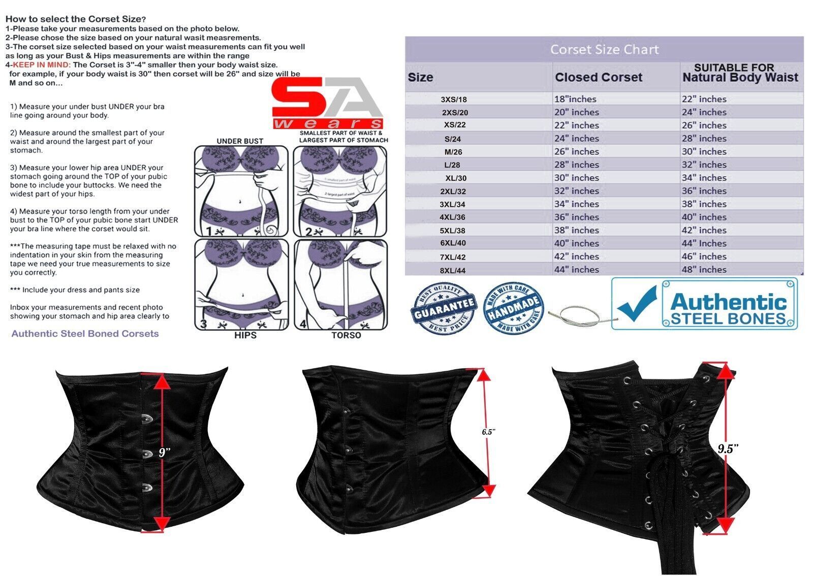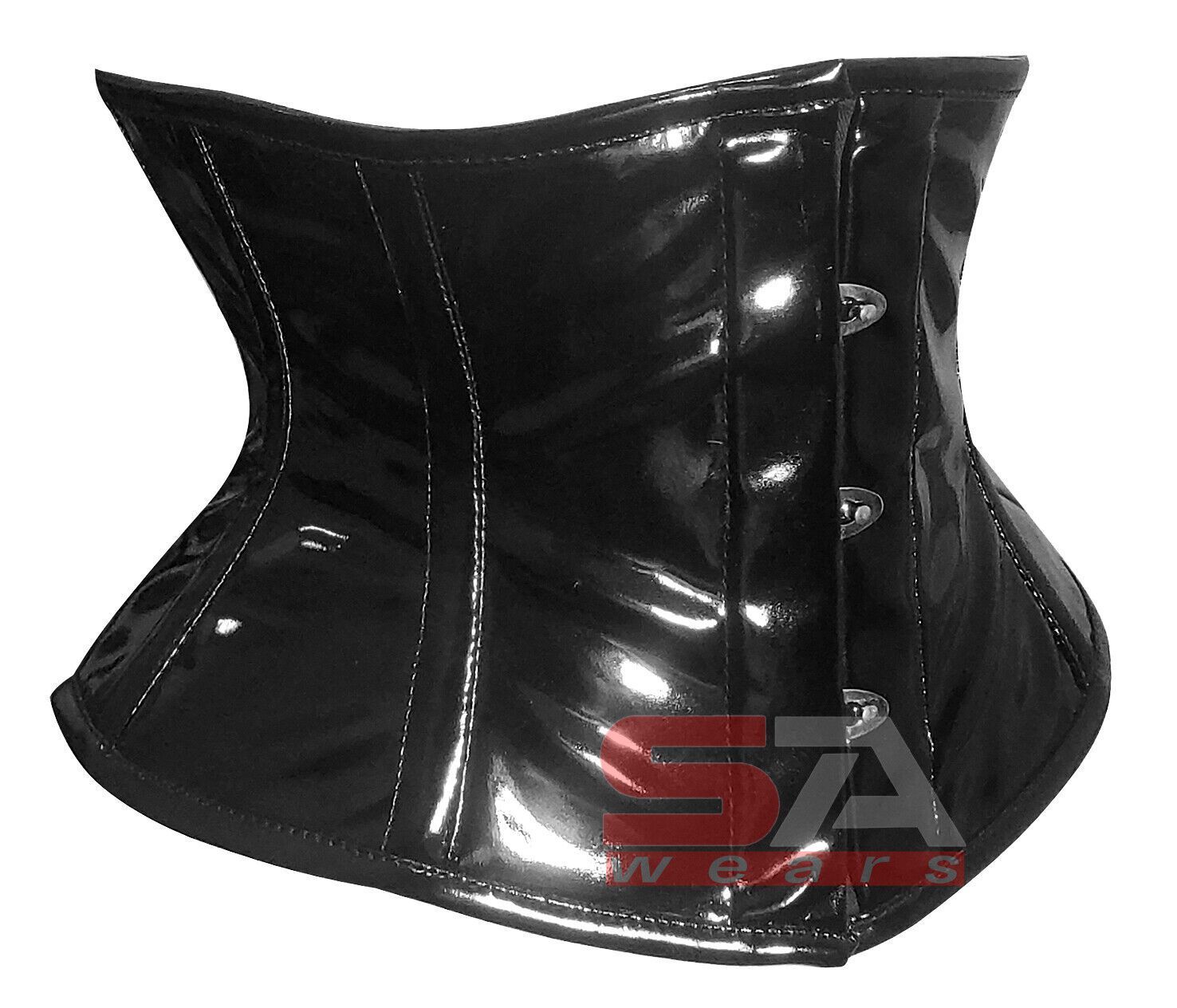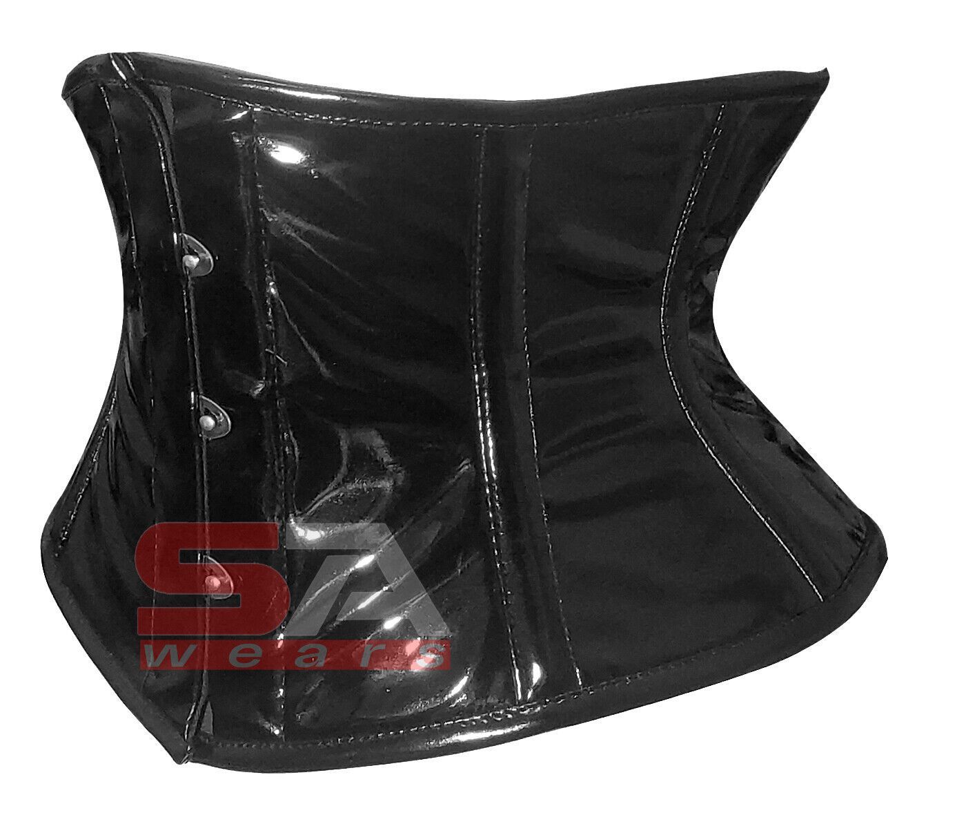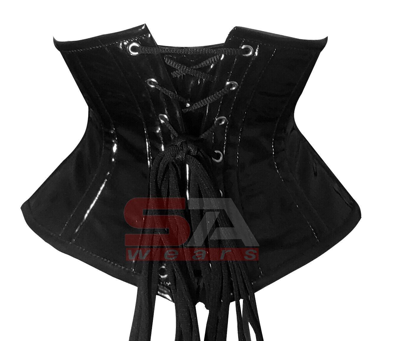 Description Corset Detail Outer shell: PVC Vinyl Inner Shell: 100% Cotton Twill Underwired: 100% steel bones Closure: Rust free metal claps Corset Front Length: 8.5 Corset Side Length: 6.5 Corset Back Length: 9 5 Modesty Panel at the back Corset features Heavy Duty, Very Strong Fully Steel Boned Cor