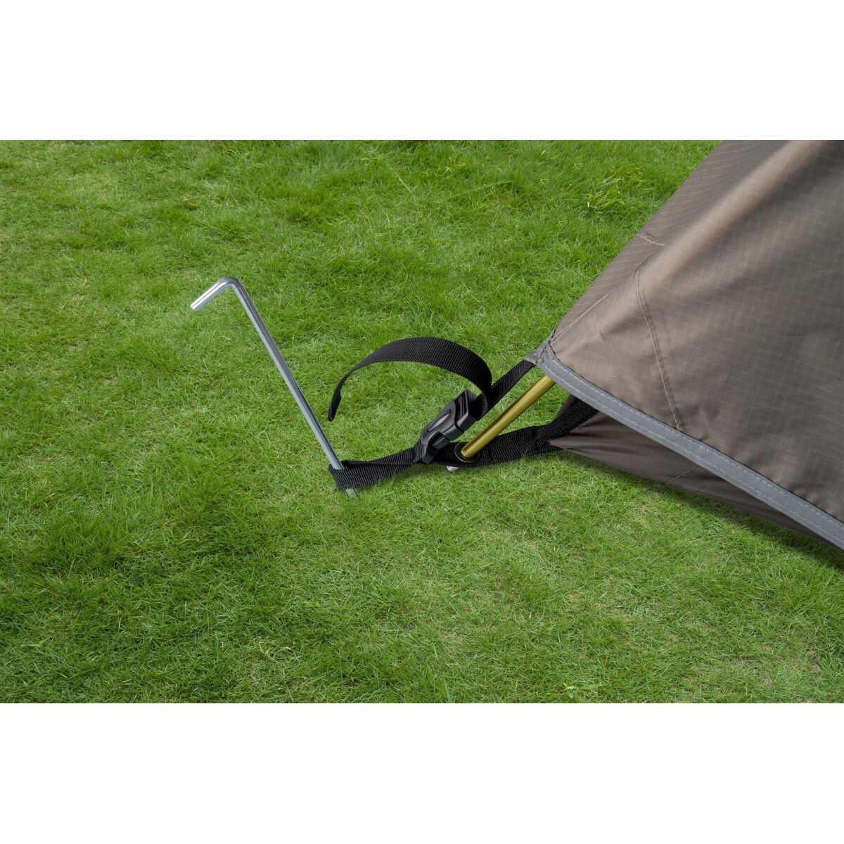 • - Baue das Zelt nicht auf Sandboden auf. Dort bestehen keine ausreichenden Verankerungsmöglichkeiten für das Zelt. - Achte darauf, dass die Spannleinen nicht zu stark angezogen werden, da bei zu großer Spannung die Zeltplane reißen kann. - Verwende das Zelt nur unter milden Wetterbedingungen. - Verwende das Zelt nicht unter Berg- und Extrembedingungen, z.B. bei Hagel, Überschwemmungen, Sturm, extremer Kälte oder Hitze.