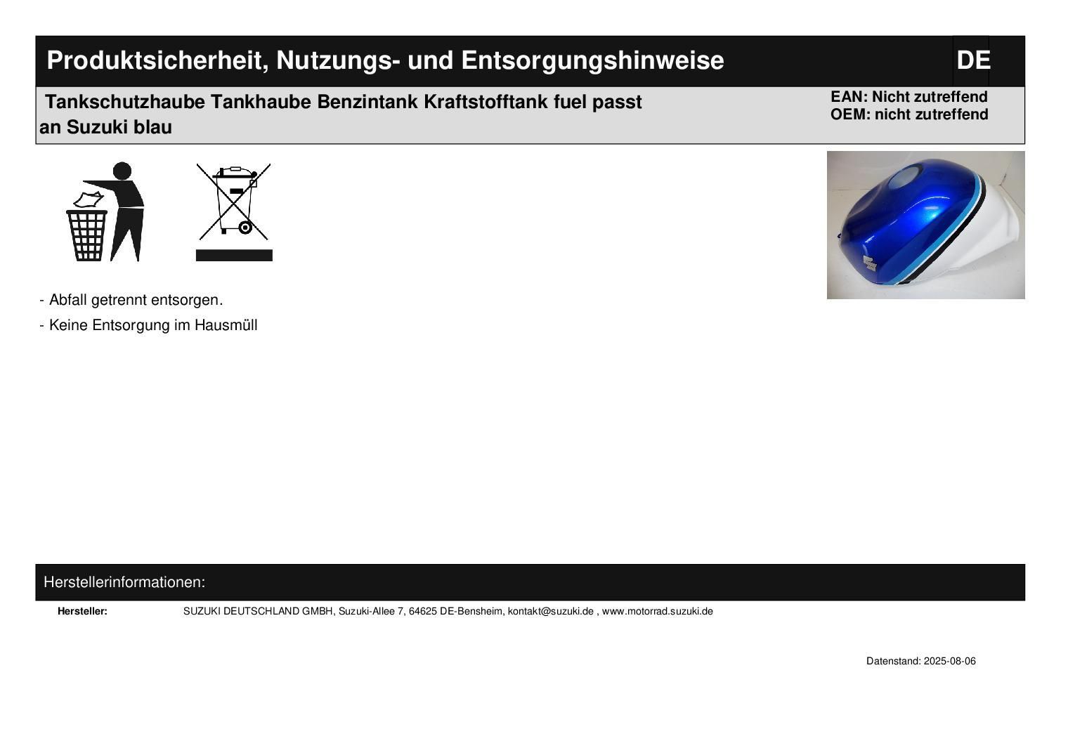Tankschutzhaube Tankhaube Benzintank Kraftstofftank fuel passt an Suzuki blau