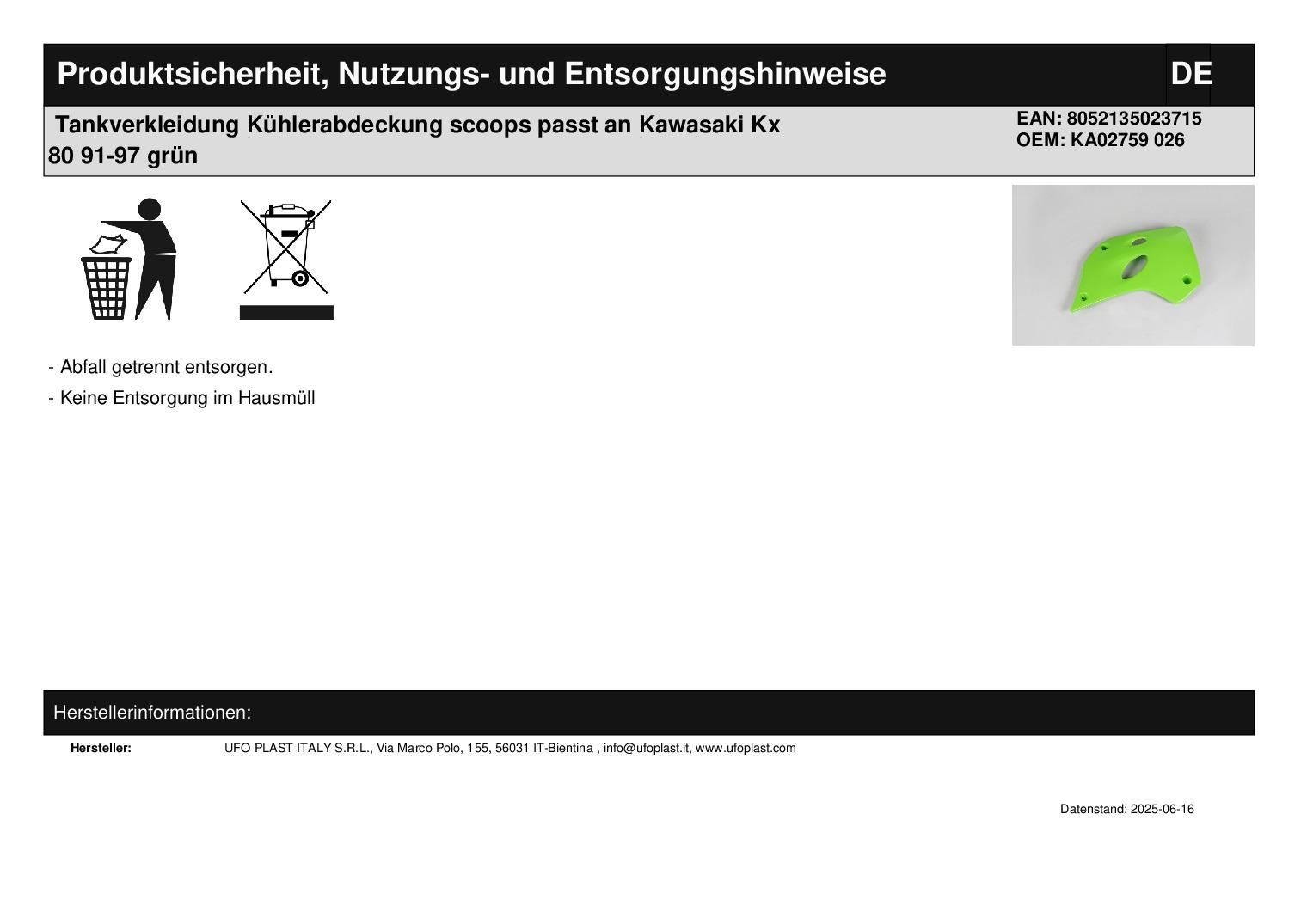 Tankverkleidung Kühlerabdeckung scoops passt an Kawasaki Kx 80 91-97 grün