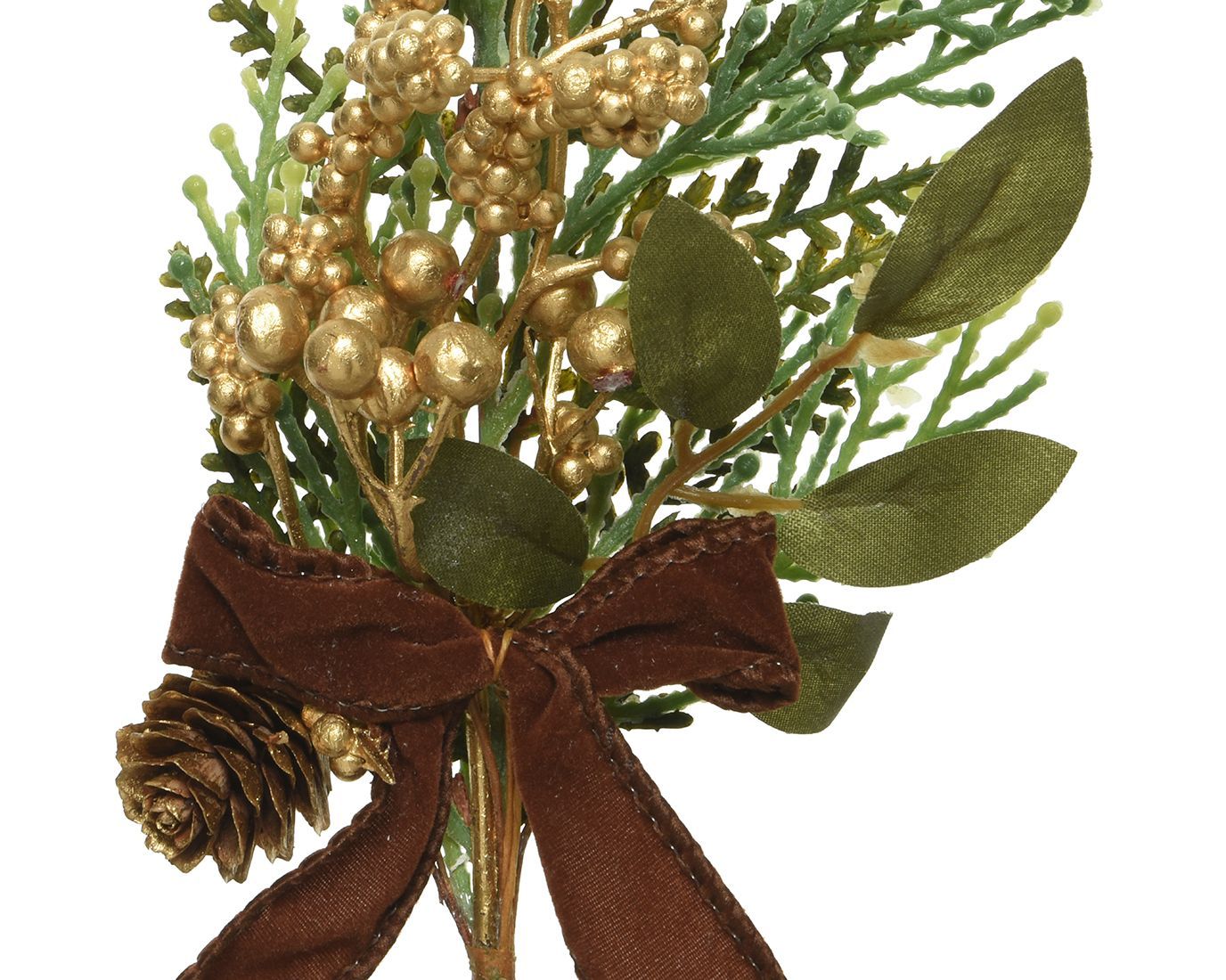 Tannenzweig künstlich 25cm mit goldenen Beeren und Samtschleife