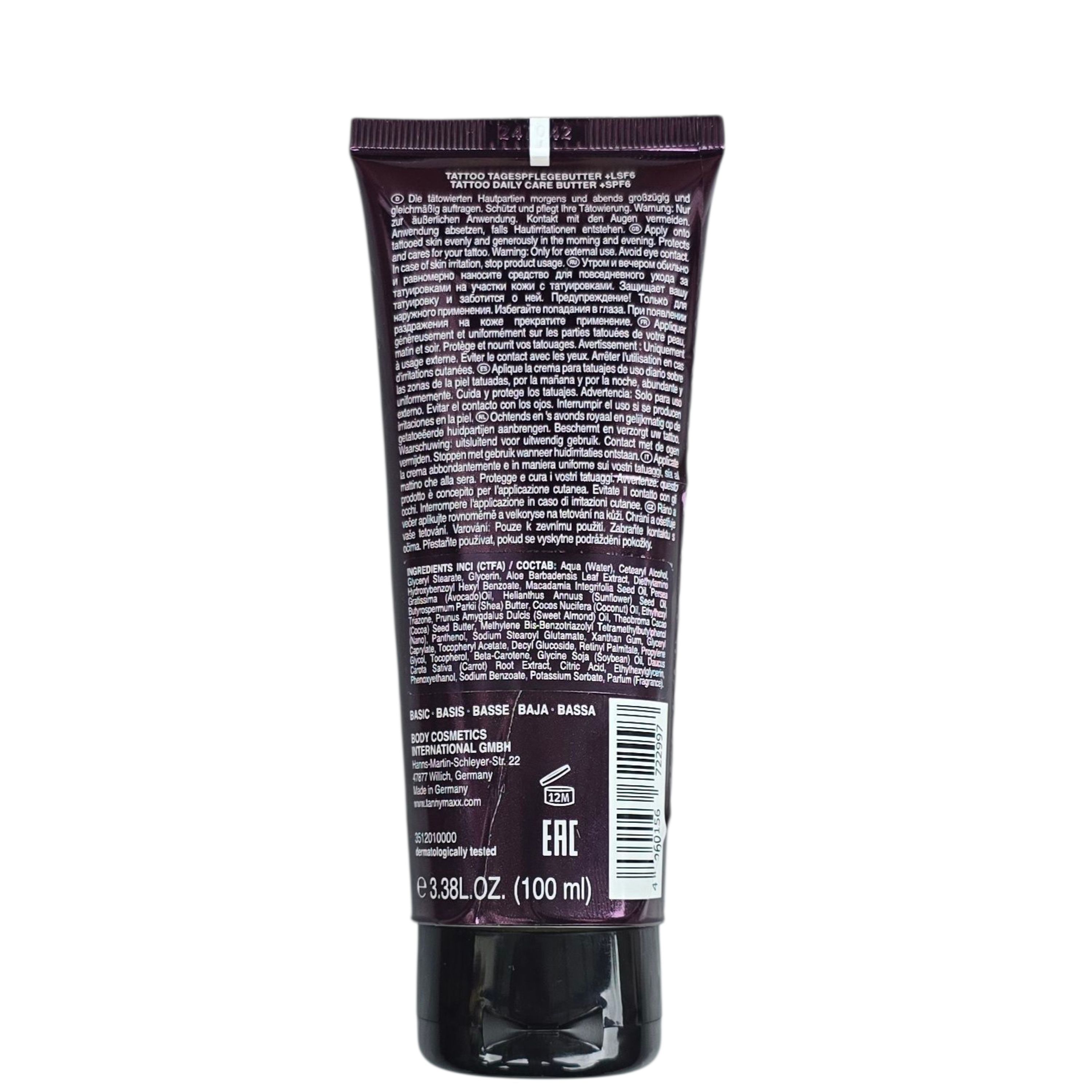Die Daily Care Tattoo Butter ist eine reichhaltige Tagespflege auf einer Butterbasis, die Ihre Kunst am Körper optimal pflegt und Ihre tätowierte Haut vor Verblassen schützt sowie die Farben intensiviert. Der Pro Colour Complex intensiviert die Farben Ihres Tattoos mit einem speziellen Komplex aus A
