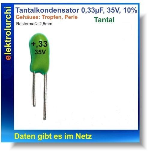 Tantal-Kondensator Elko 0,33µF/35V, 0,33uF, RM2,5mm, 85°C, bedrahtet, 10 St