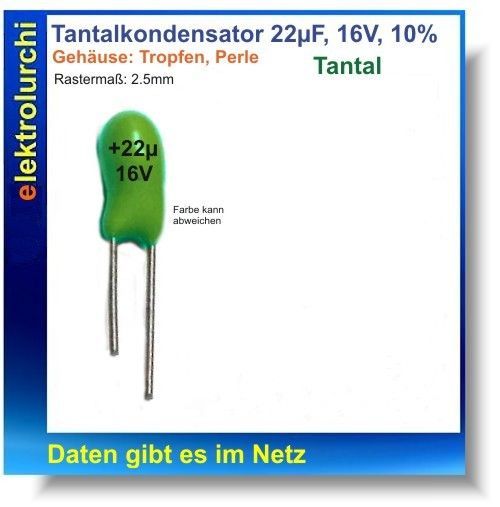 Sie bieten hier auf folgenden Artikel 2 Stück Tantalkondensator 22µF 16V, 22uF, Tropfen Perle RM 2,5mm, 10% Artikelbezeichnung: 22µF 16V Abmessungen: Durchschitt6mm x h10m Rastermaß: 2.5mm Typ: Tropfen, Perle Temperatur: -40 bis 85°C Gehäusefarbe: blau oder grün