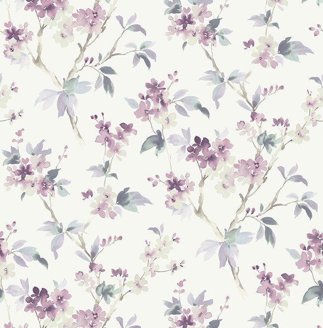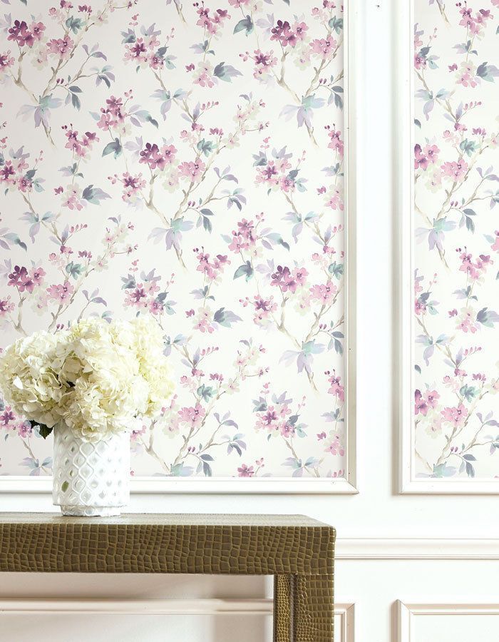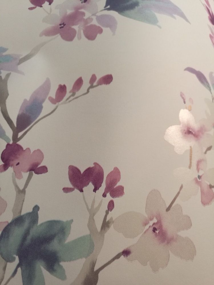 • Tapete, Designtapete, Moiréeimitat, Landhaus, floral, flieder, sand, weiß, Glanz