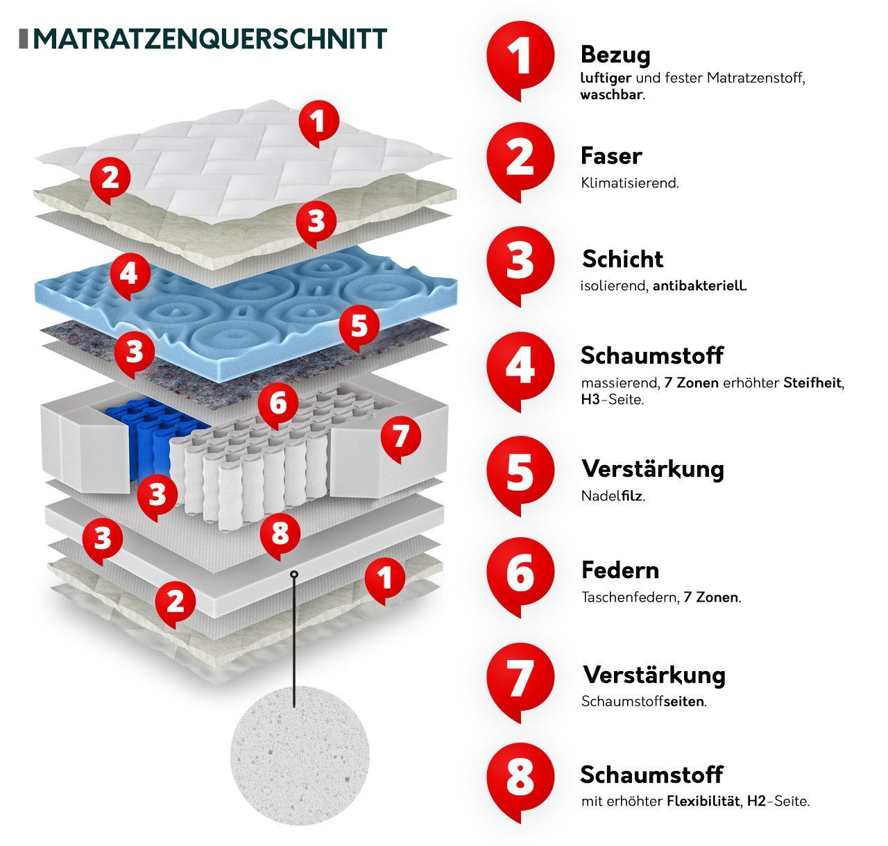Taschenfederkernmatratze Blue Line 19cm Massageschaumstoff Beidseitig Matratze H2/ H3