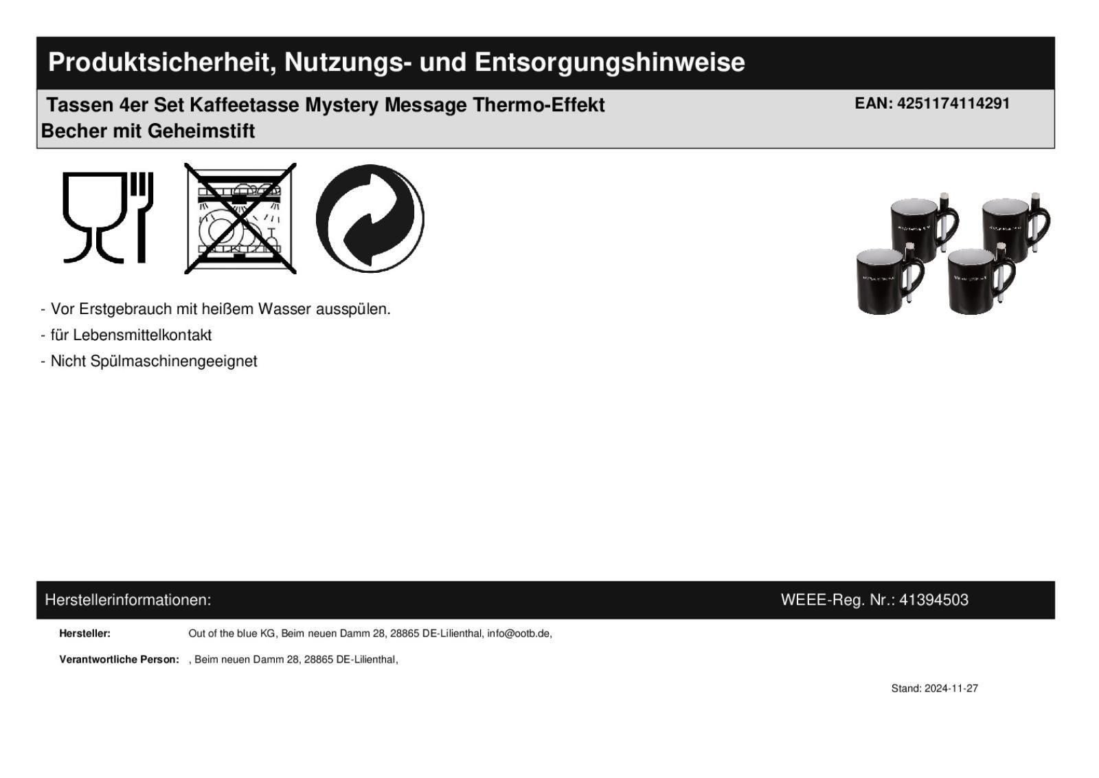 Out of the Blue Tassen 4er Set Kaffeetasse Thermo-Effekt Mystery Message Becher mit Geheimstift