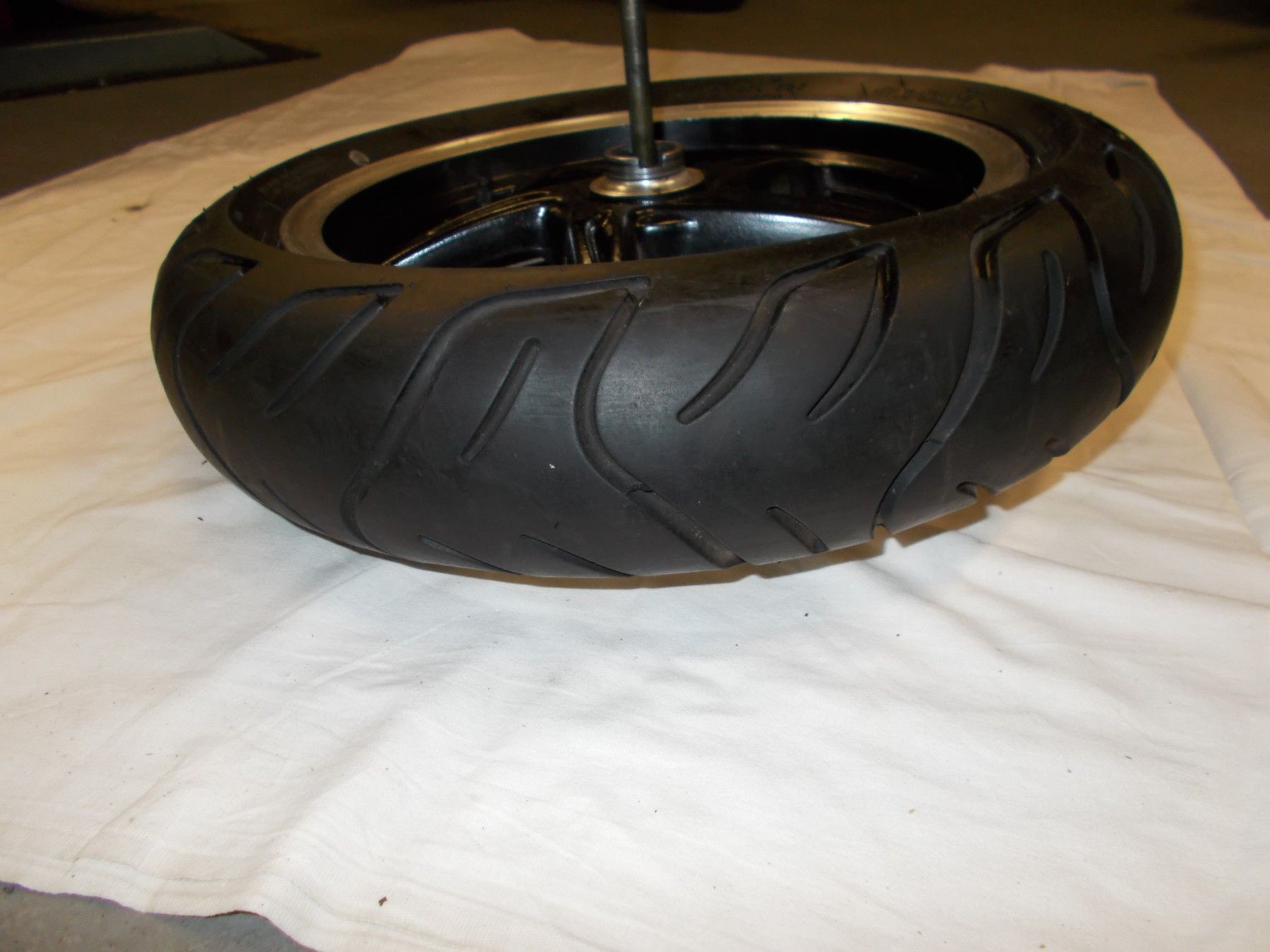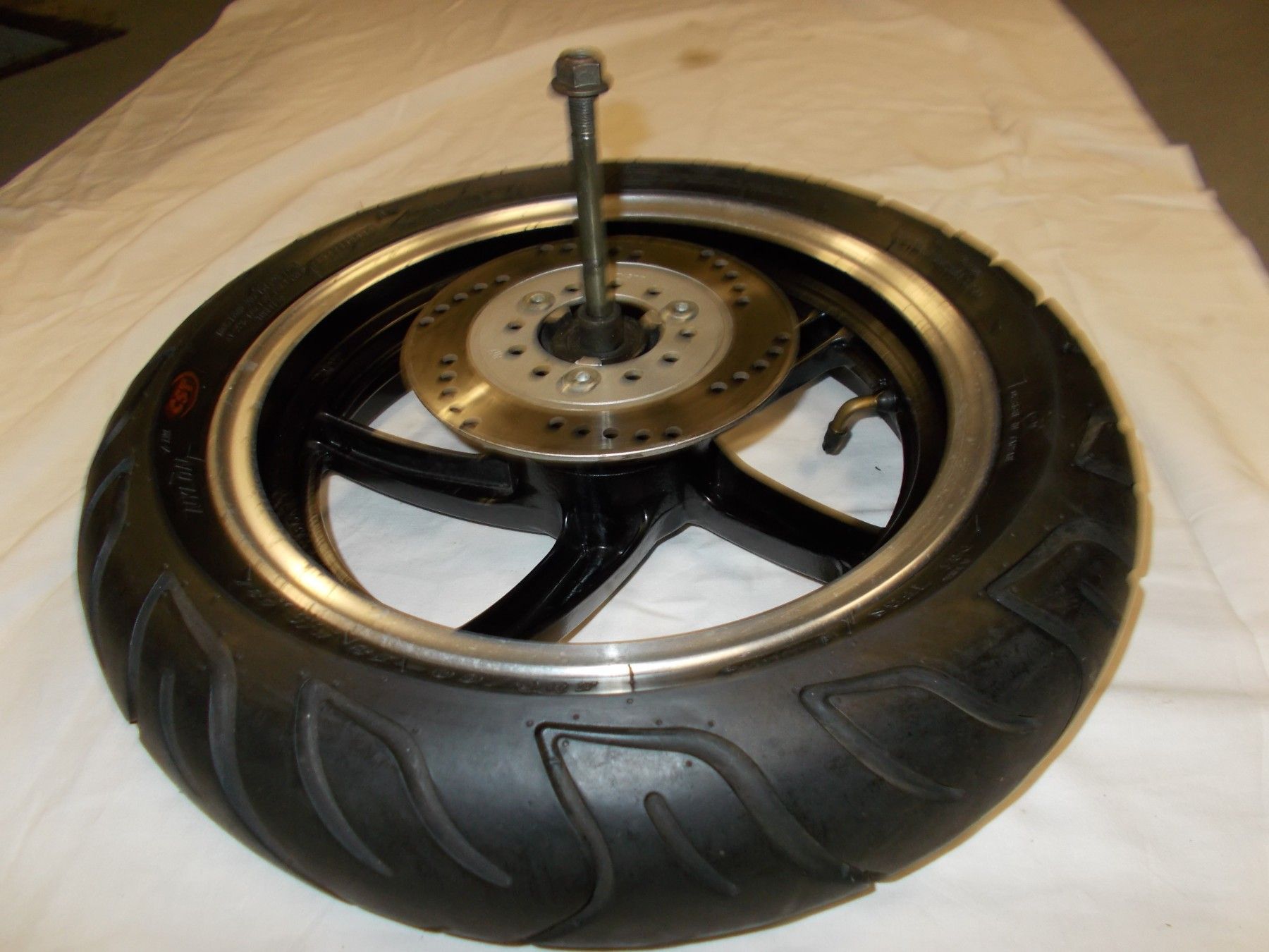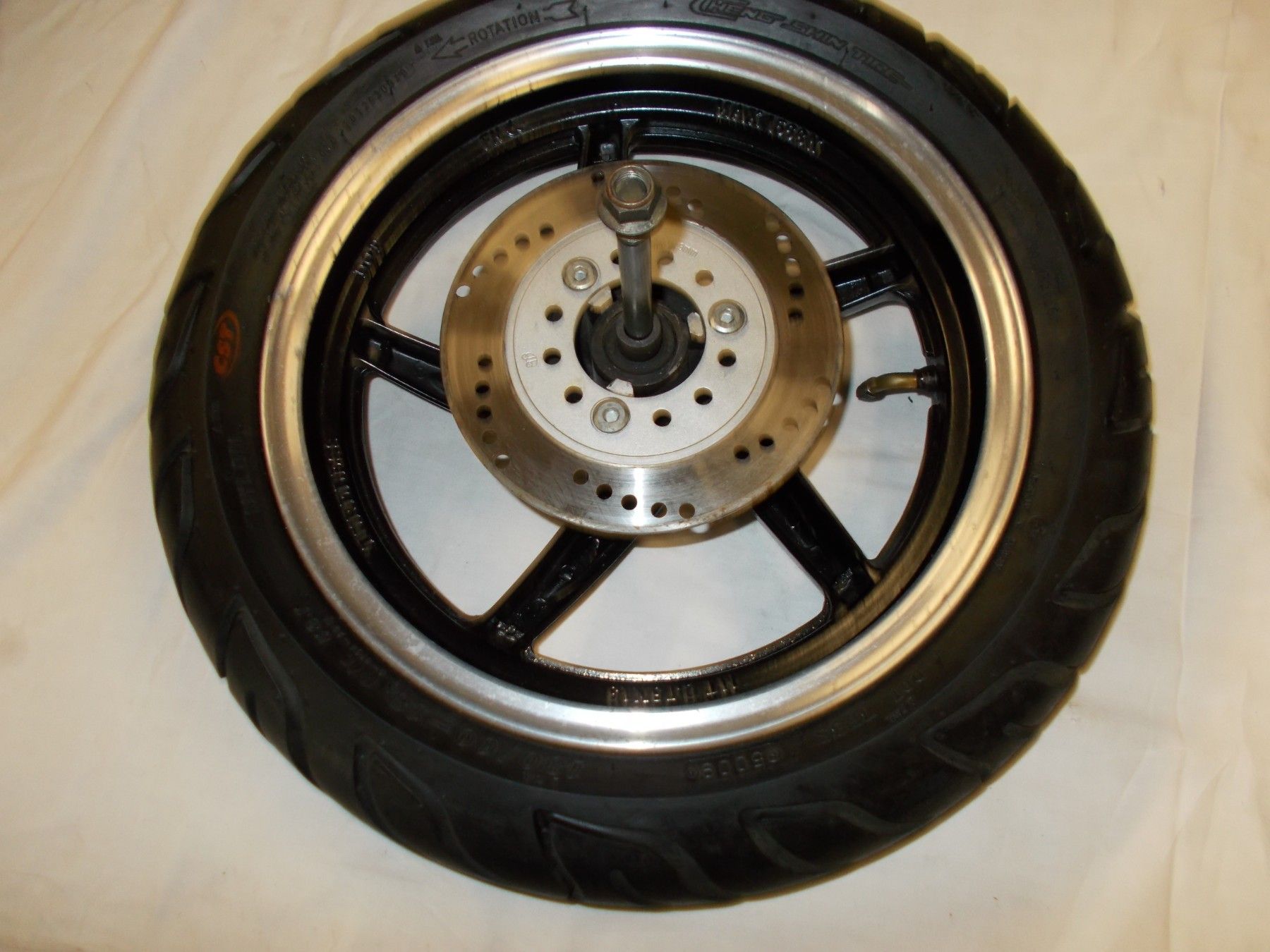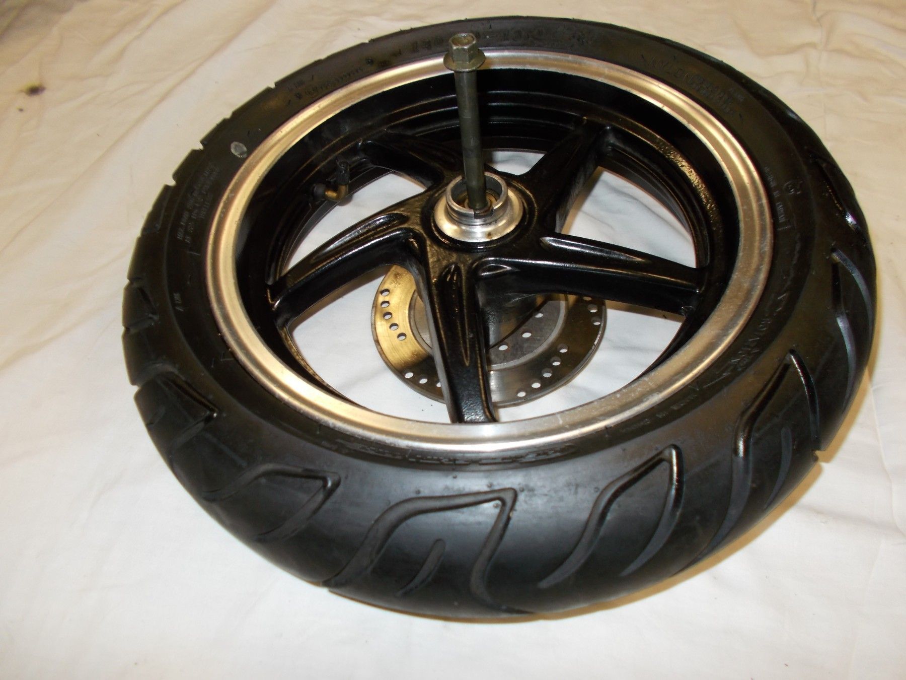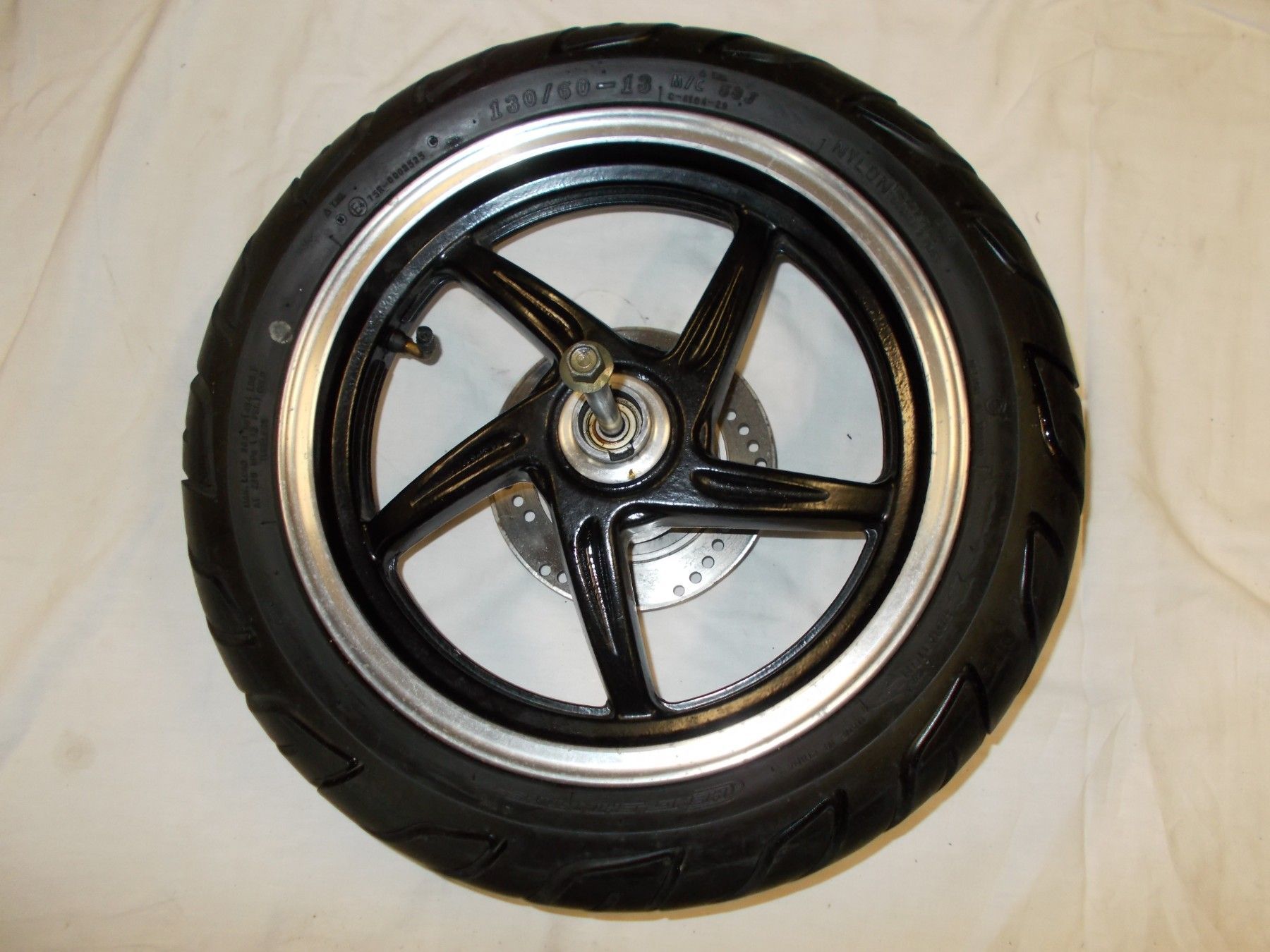 Gebrauchte Felge incl. Bremsscheibe, Reifen, Steckachse und Distanzbuchse von einem Motorroller Tauris Fiera extreme 50ccm . Neuwertiger Zustand da wenig Laufleistung. Bereifung 130 60-13 mit ca. 80-90% Profil.
