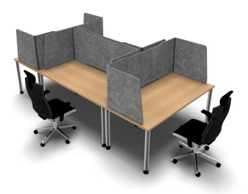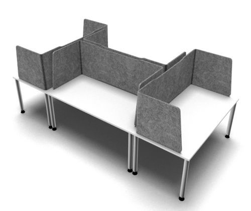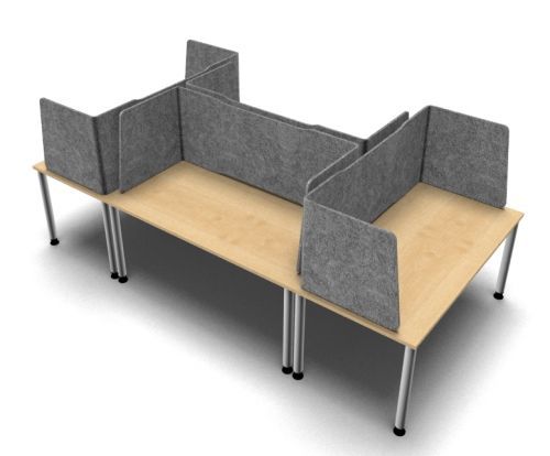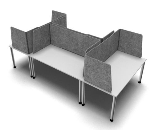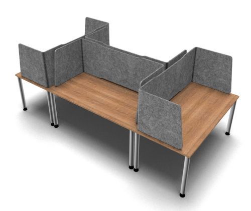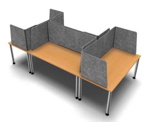 Teamarbeitsplatz TH3 für 4 Personen, Stellfläche 160 x 320 cm, bestehend aus 4 Schreibtischen 160 cm und 4 Akustik-Einhausungen grau-meliert. Dekorfarbe wählbar.