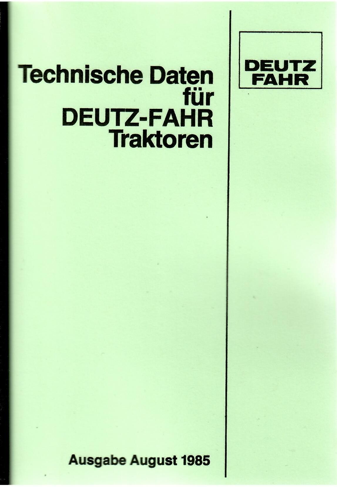 Technische Daten für Deutz-Fahr Traktoren Enthält die wichtigsten technischen Daten zu Fahrwerk, Motor, Kupplung, Zapfwelle, Getriebe, Elektrik, Hydraulik etc. folgender Hinterrad- und Allrad-Typen: D 2807, D 3607, D 4507, DX 3.10 bis DX 3.90, DX 4.10 bis DX 4.70, DX 6.10 bis DX 6.50, DX 7.10, DX 8.