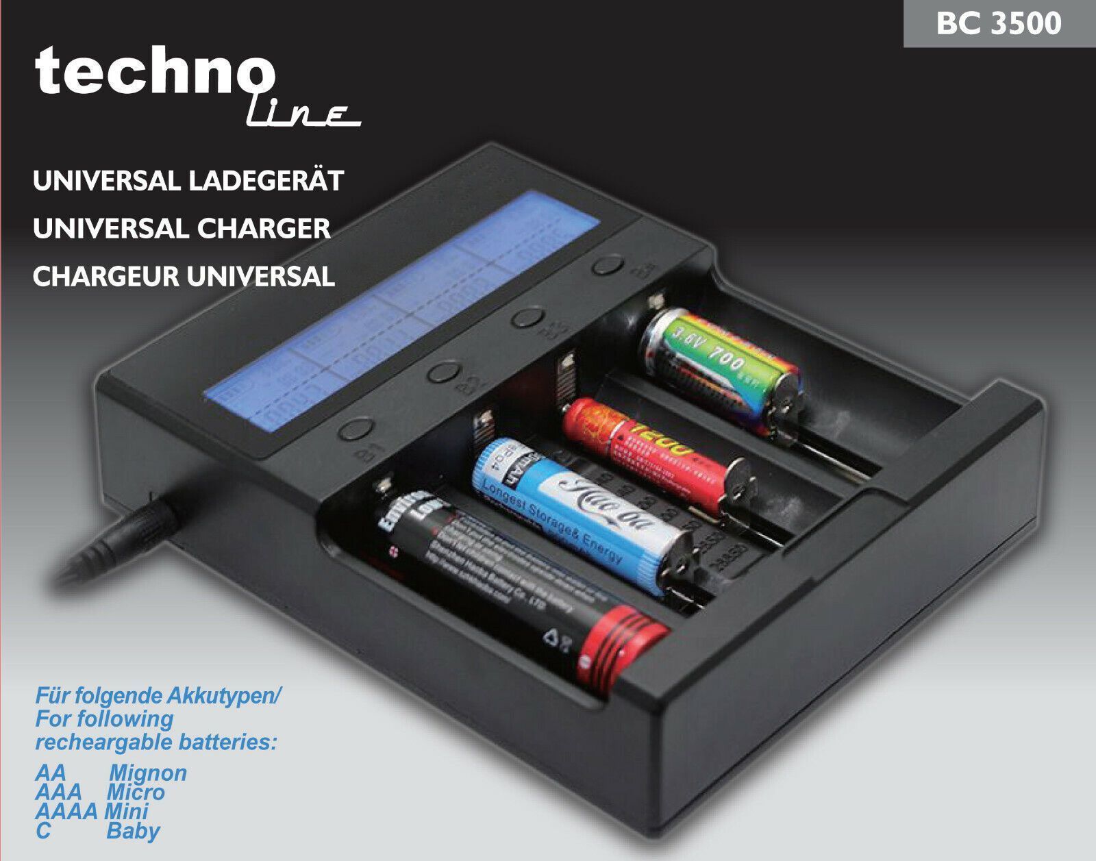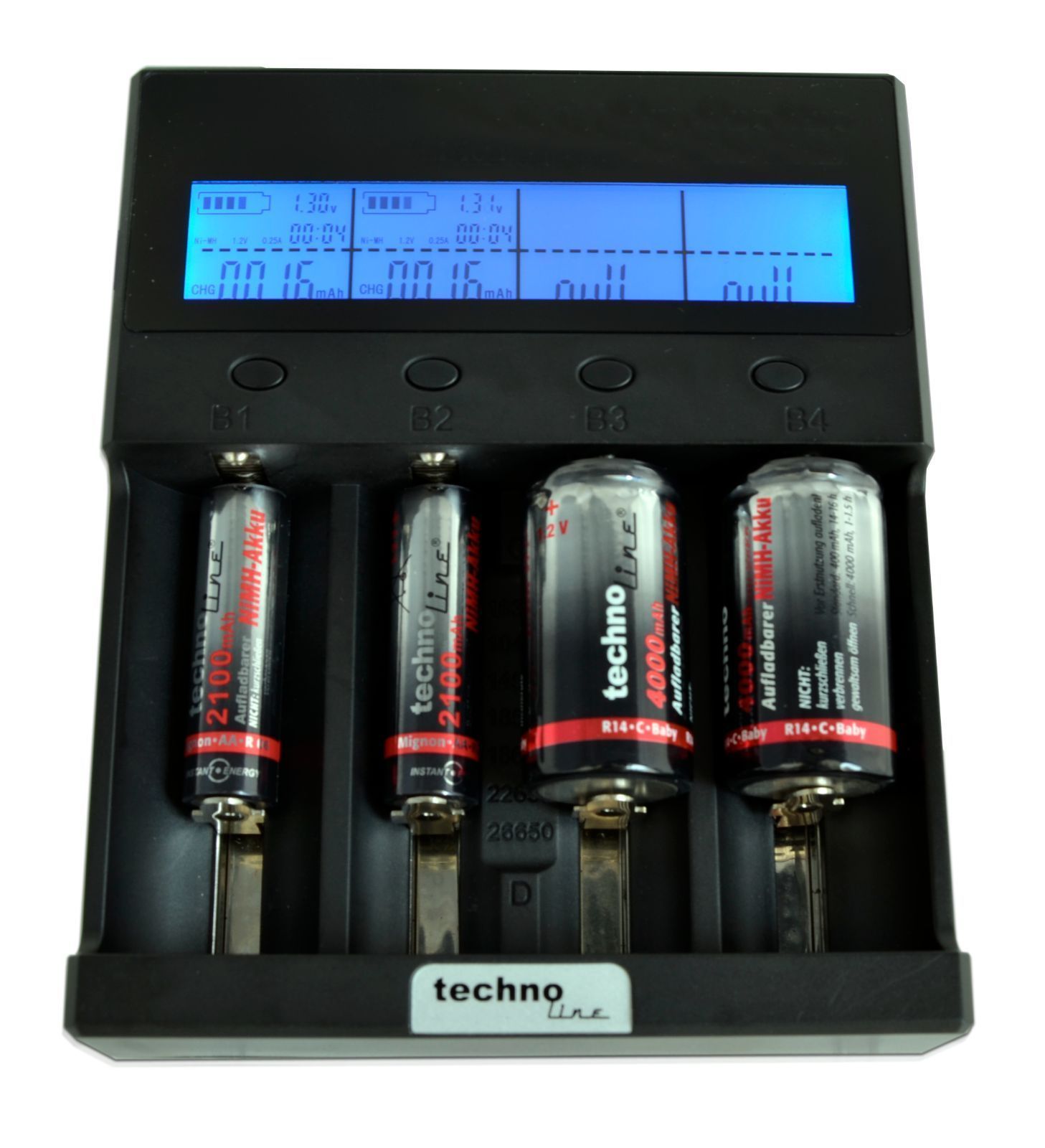 BC 3500 Technoline Ladegerät mit LCD Display Informationen zum Ladegerät iAufladbare Batterien LiFePO4 4 Batterien gleichzeitig aufladbar kompatibel mit Li-ion Ni-MH Ni-Cd Akkus (Automatische Erkennung) Kompatibel mit Li-ion Batterietyp: 26650, 22650, 18650, 17670, 18490, 17500, 18350, 16340 (RCR123