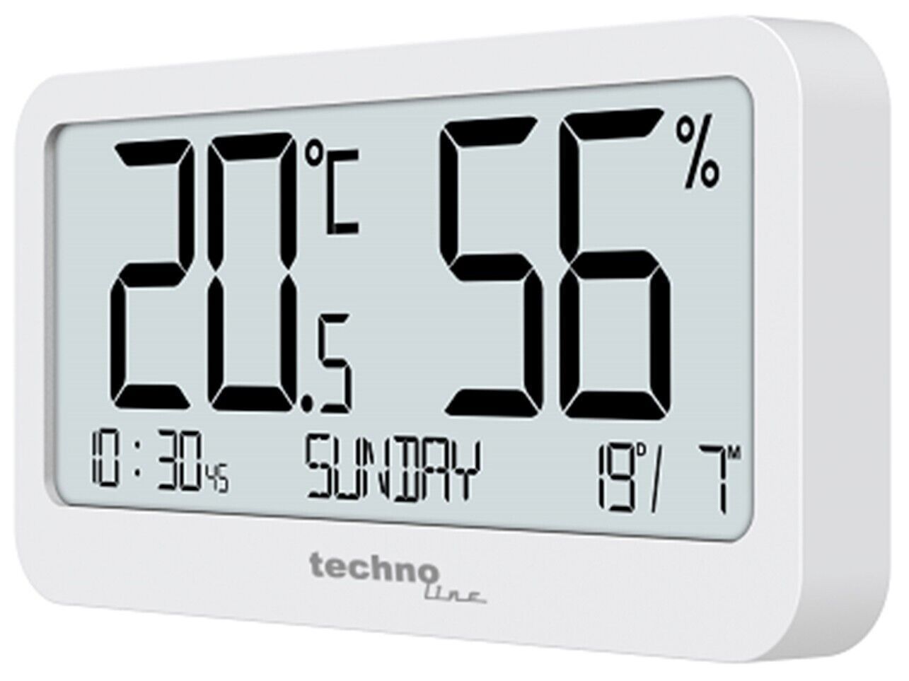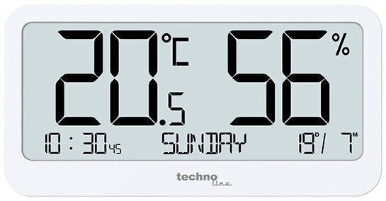 Euro Quarzuhr Euro Datums- und Wochentagsanzeige Euro Innentemperaturanzeige Euro Innenluftfeuchtigkeitsanzeige Euro MIN MAX Speicherung Euro Batterieendanzeige Euro Wandaufhängung oder Tischafstellung Technische Daten Thermo-Hygrometer WS 9455 Abmessungen (BxHxT): 107 x 55 x 13 mm Stromversorgung: