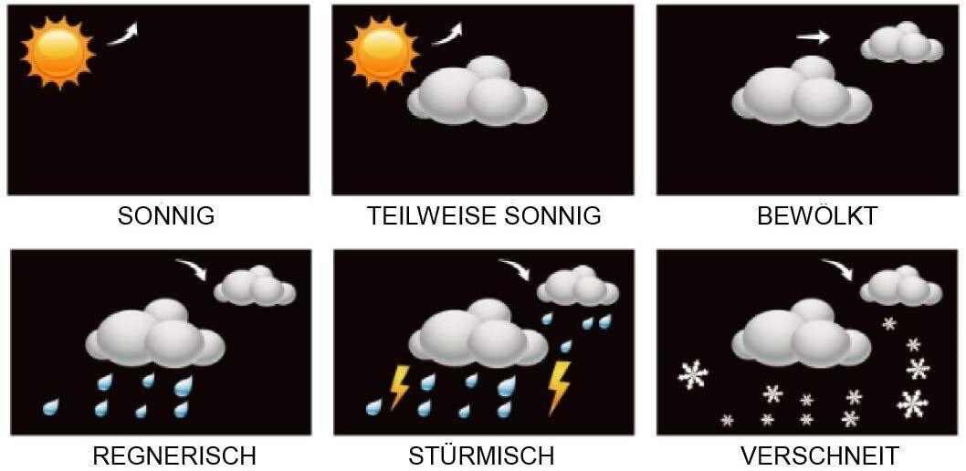 Mit der WS 6446 haben Sie nicht nur eine einfache Wetterstation mit allen wichtigen Daten rund um Wetter und Temperatur, sondern obendrein, Dank des farbigen Displays und des modernen Designs, einen echten Hingucker. farbige Wettersymbole: sonnig, teilweise sonnig, bewölkt, regnerisch, stürmisch ode