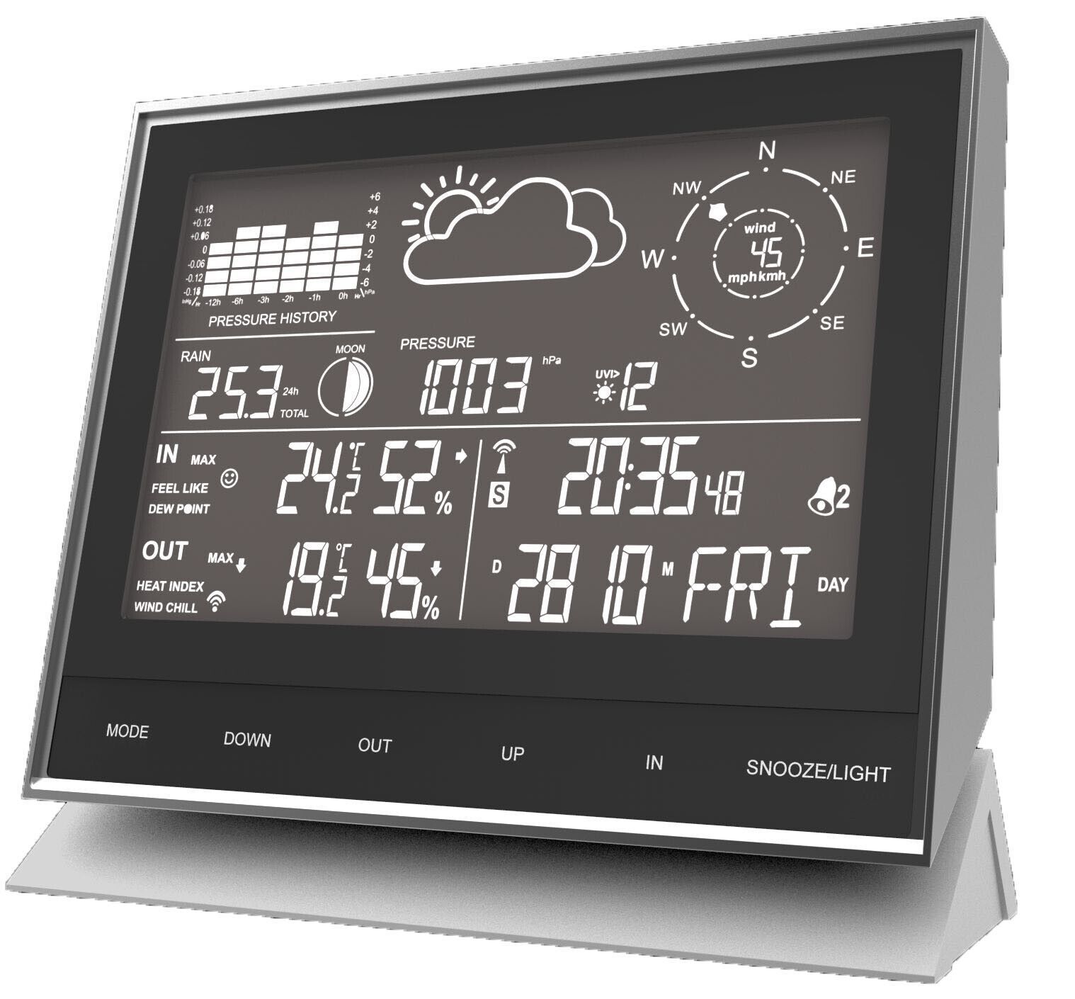 WS 1700 Wettercenter DCF-77 Funkuhr mit manueller Einstelloption 12 24h Zeitanzeige Datums- und Wochentagsanzeige Innen- und Außentemperaturanzeige Innen- und Außenluftfeuchteanzeige MIN MAX Speicherung Windchill- und Hitze-Index-Anzeige (gefühlte Temperatur) Taupunktanzeige Windrichtungs- und Windg
