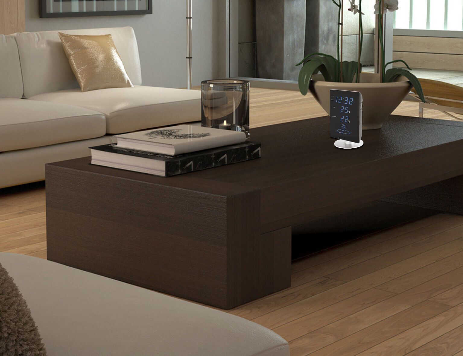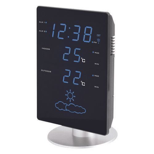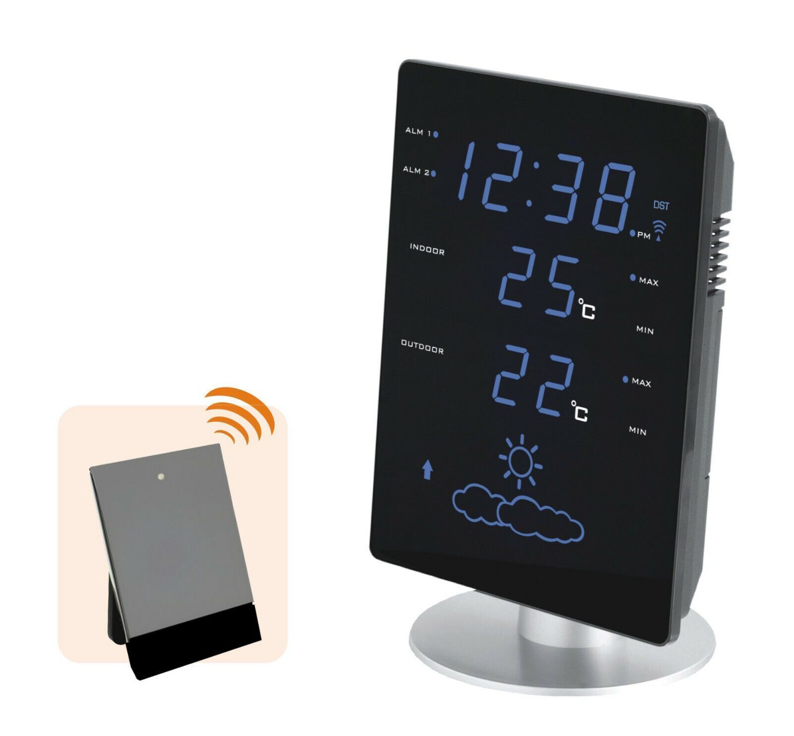 DCF-77 Funkuhr mit manueller Einstelloption Zeitzoneneinstellung (± 1 h) Innen- und Außentemperaturanzeige Vorhersage von Wettersituationen und Wettertendenz 2 Weckalarme mit Schlummerfunktion 2 Helligkeitsstufen einstellbar Wandaufhängung oder Tischaufstellung inkl.Außensender TX96(TW004) TECHNISCH