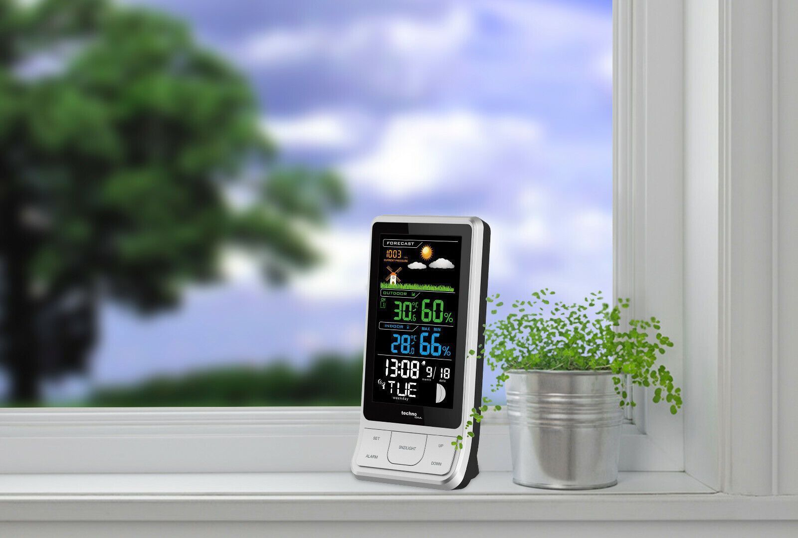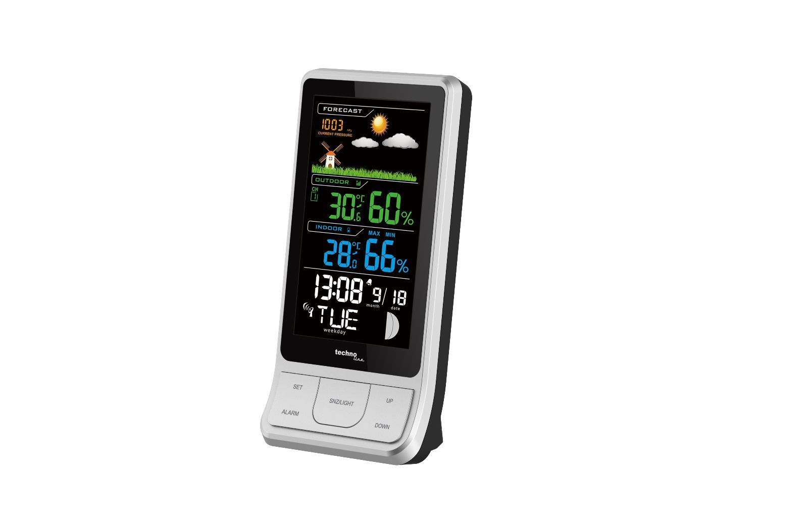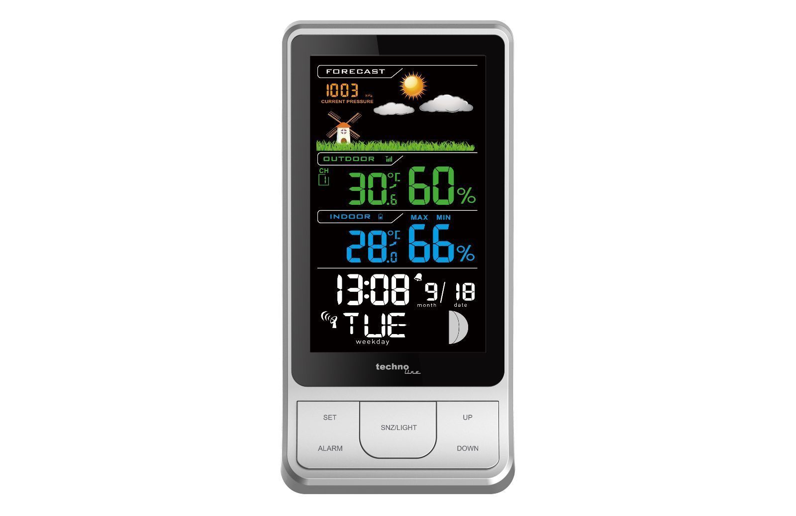 DCF77 funkgesteuerte Uhrzeit Anzeige der absoluten Luftdruckwerte Wettervorhersage-Symbole: sonnig, teilweise bewölkt, bewölkt, regnerisch 4-stellige Luftdruckanzeige Batterieendanzeige für Außensender und Basisstation Zeitanzeige: Stunde, Minute Datumsanzeige: Monat, Datum 7 Sprachen für Wochentags