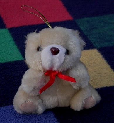 Bärchen Der kleine Bär hat ein weiches Fell aus Kunstfaser und er ist weich gepolstert. Er hat ein rotes Band um den Hals, vorne mit einer Schleife. Oben ist ein goldfarbener Aufhänger. Die Ohren sind sehr kurz, so dass man zweifeln könnte, ob es überhaupt ein Bär ist oder vielleicht ein Erdhörnchen