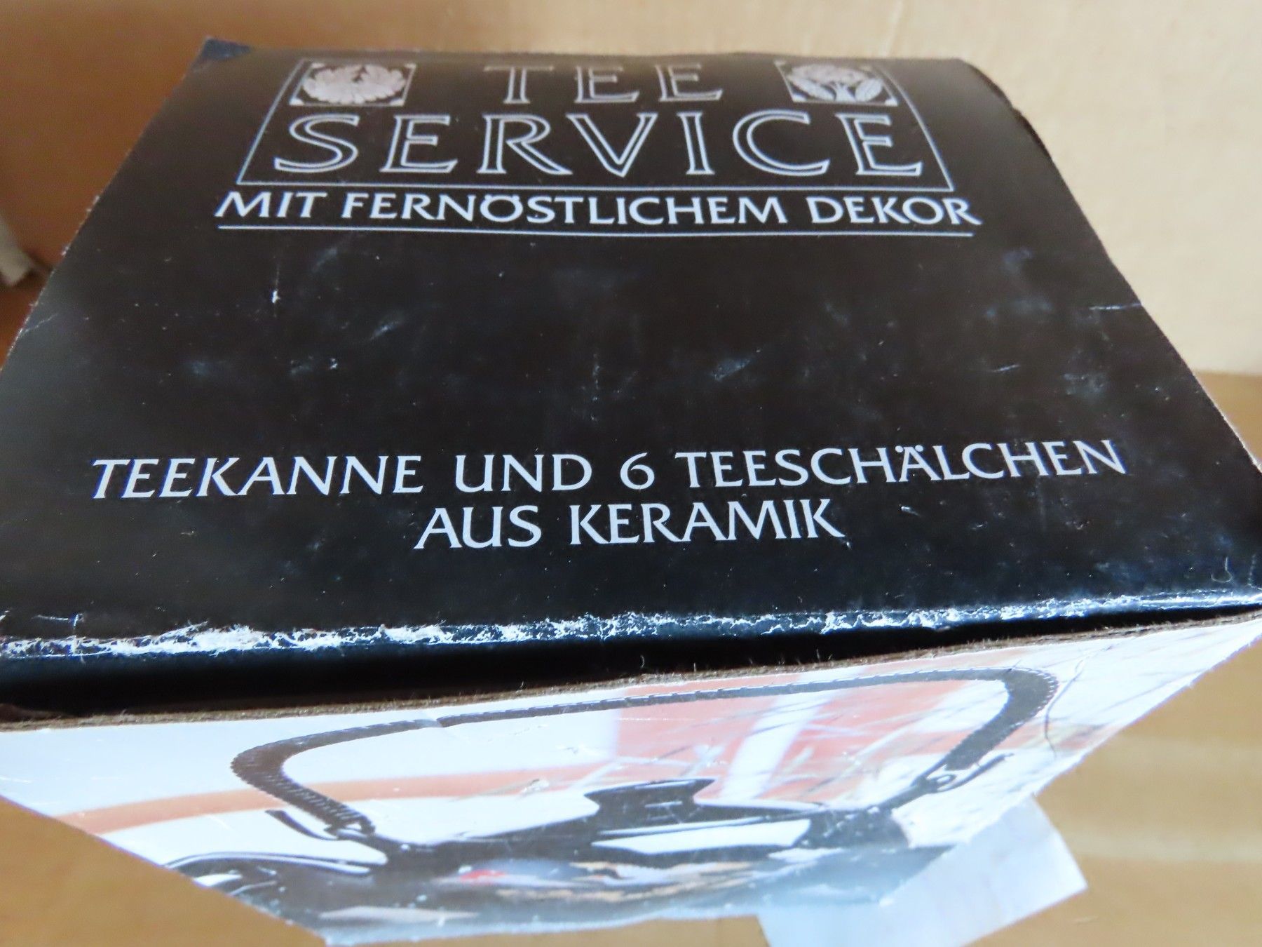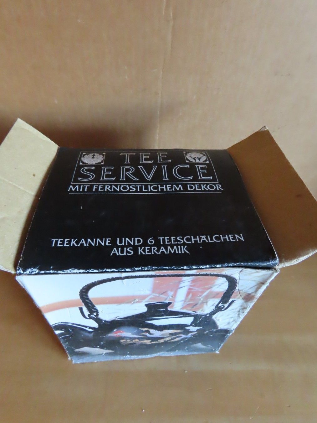 Original Verpackt - Kanne fasst ca. 500 ml hat ein Dekor mit 6 Teeschälchen die sind nur einfach schwarz Material: Keramik Verpackung ist leicht verschmutzt verstaubt ich konnte nicht erkennen ob es im gebrauch war