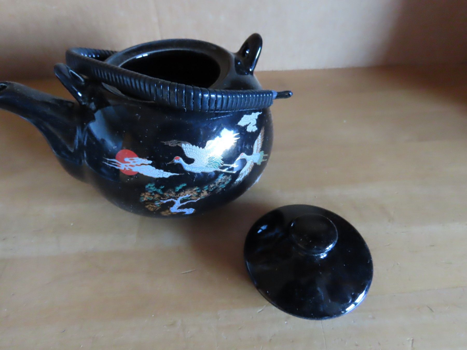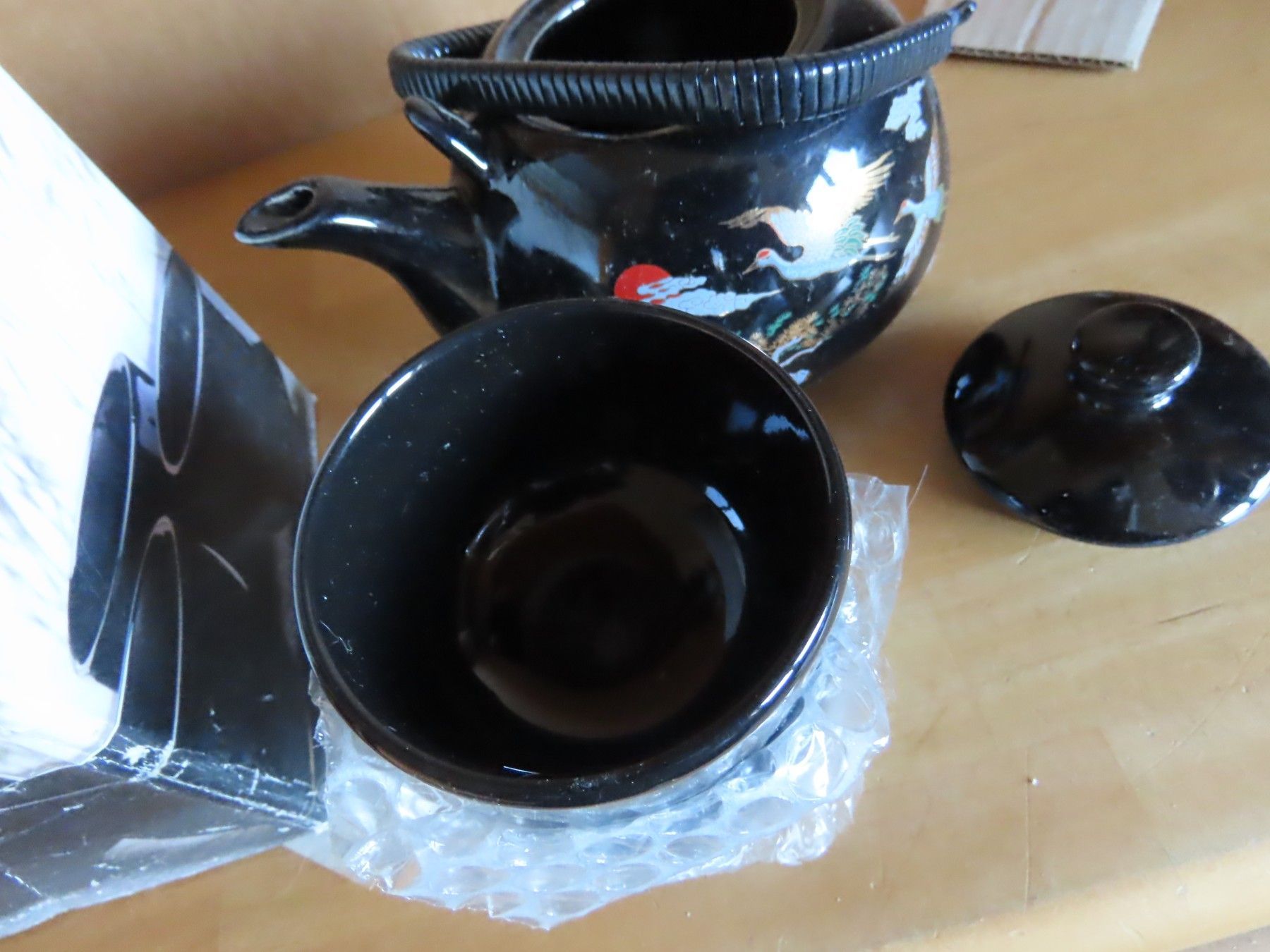 Tee-Service mit fernöstlichem Dekor schwarz Keramik Kanne + 6 Teegefäße