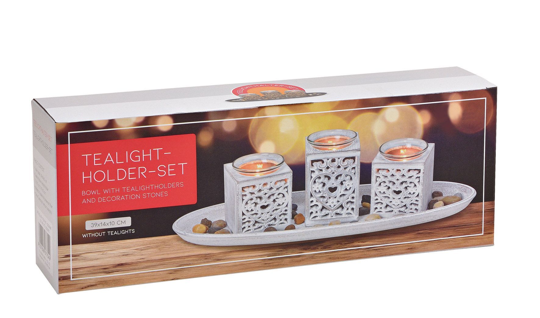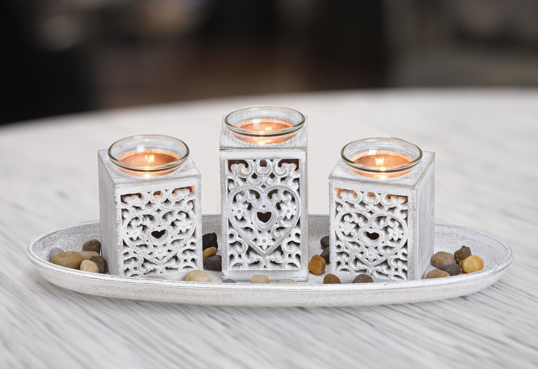 Romantisches Dekoset in shabby weiß mit 3 Teelicht Haltern auf einem Tablett inklusive Deko Steinen