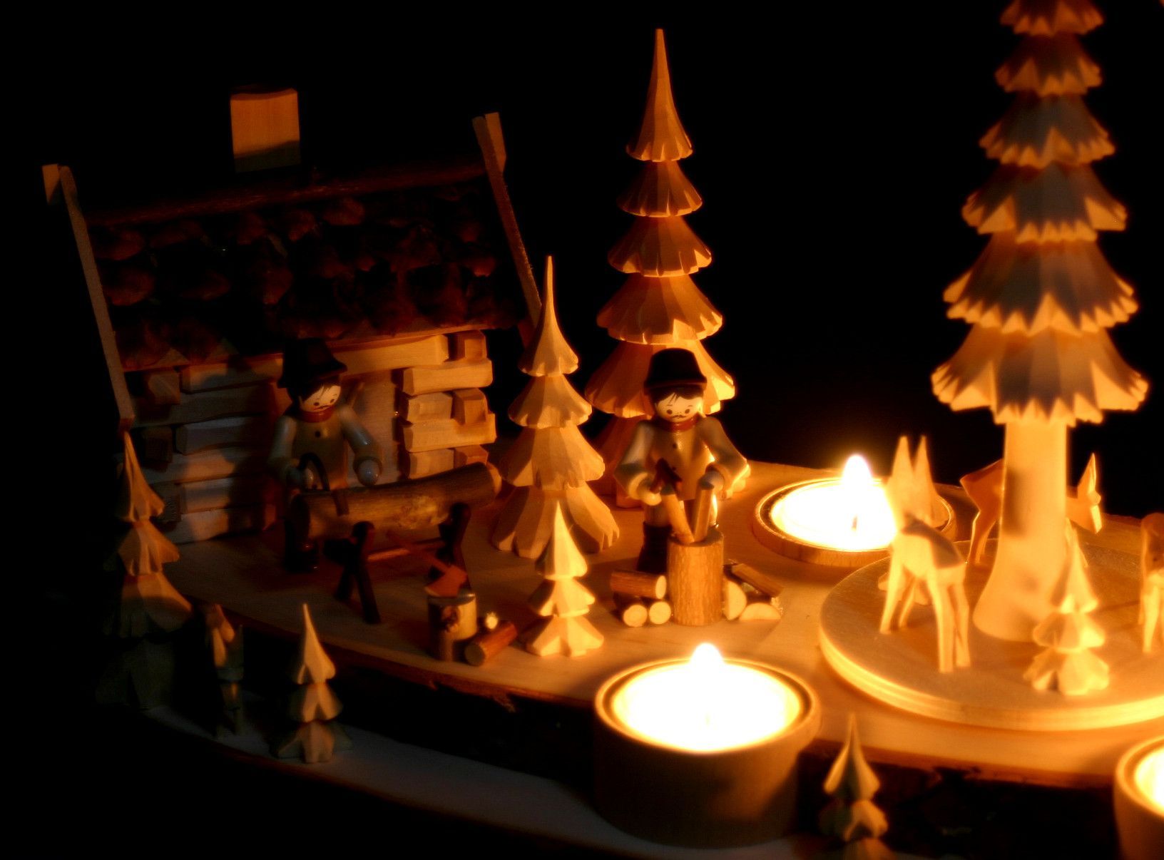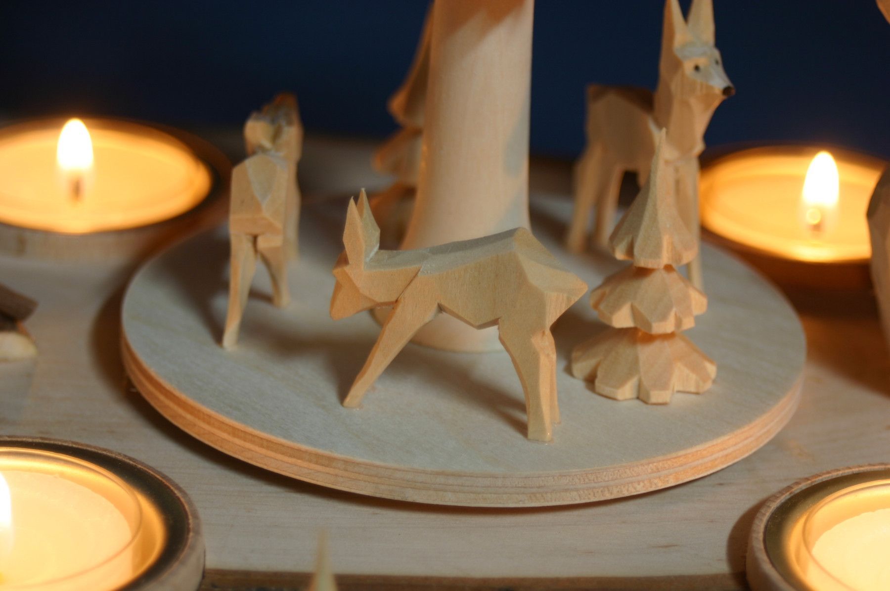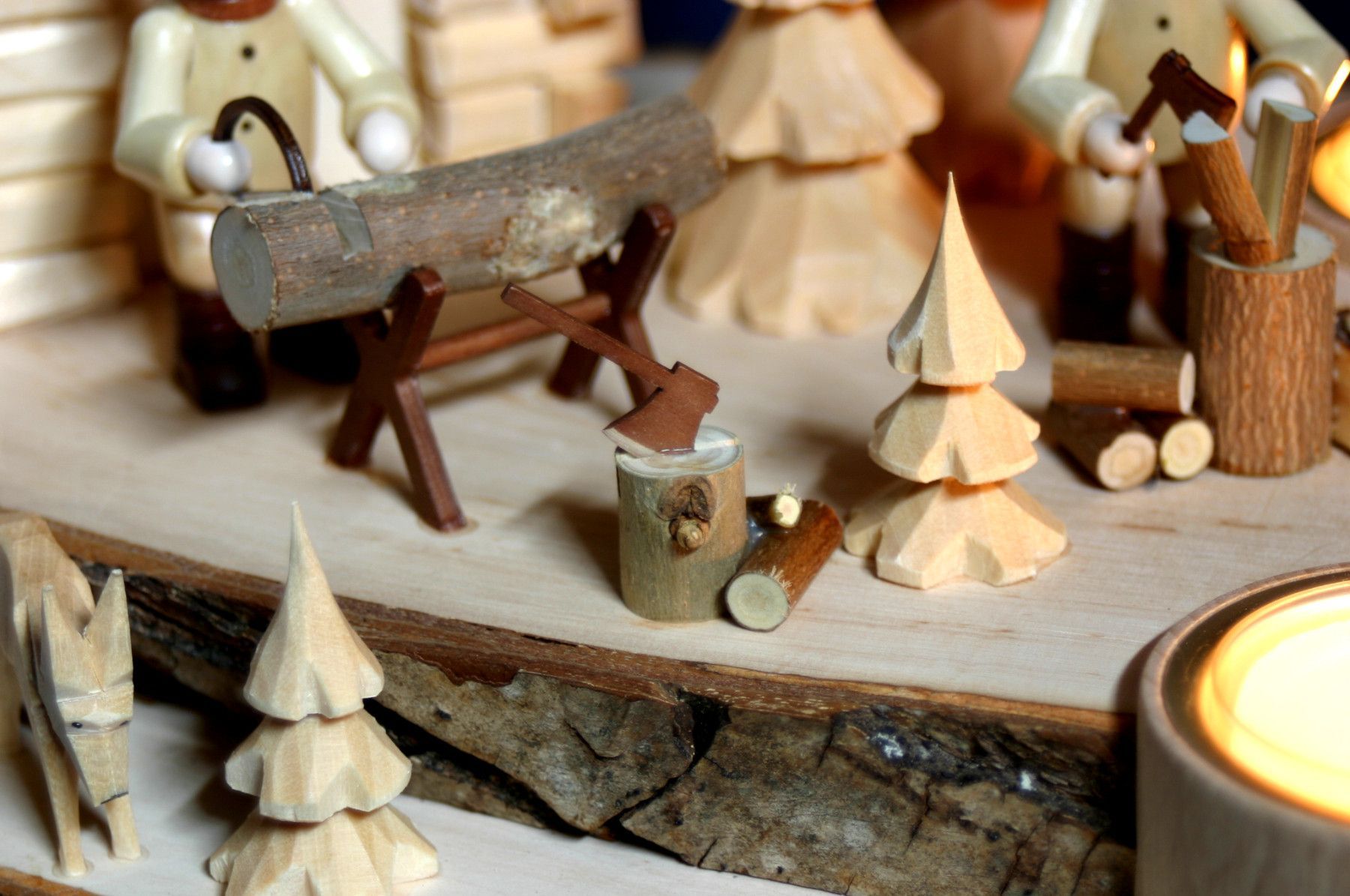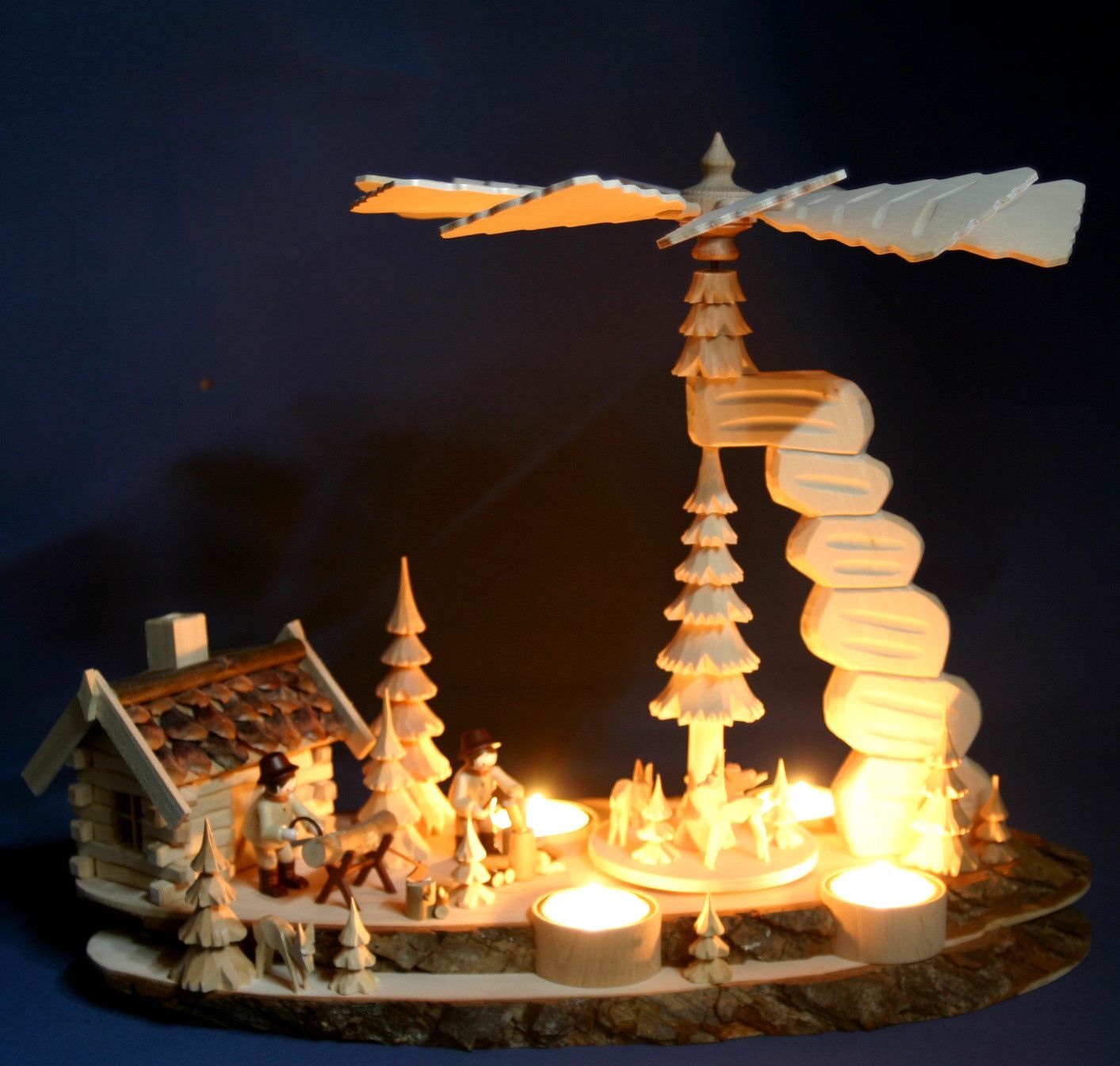 Teelicht Pyramide geschnitzt mit doppelter Baumscheibe & Räucherhaus Erzgebirge