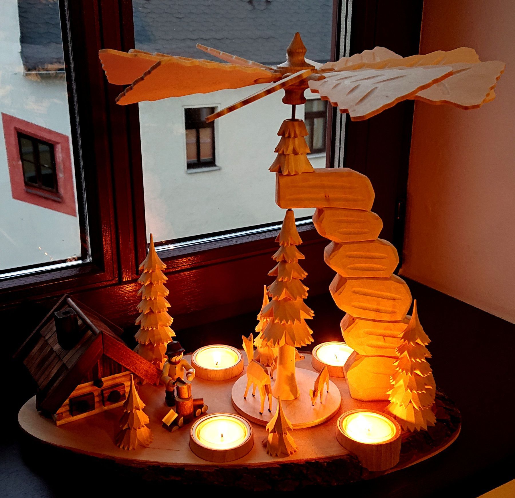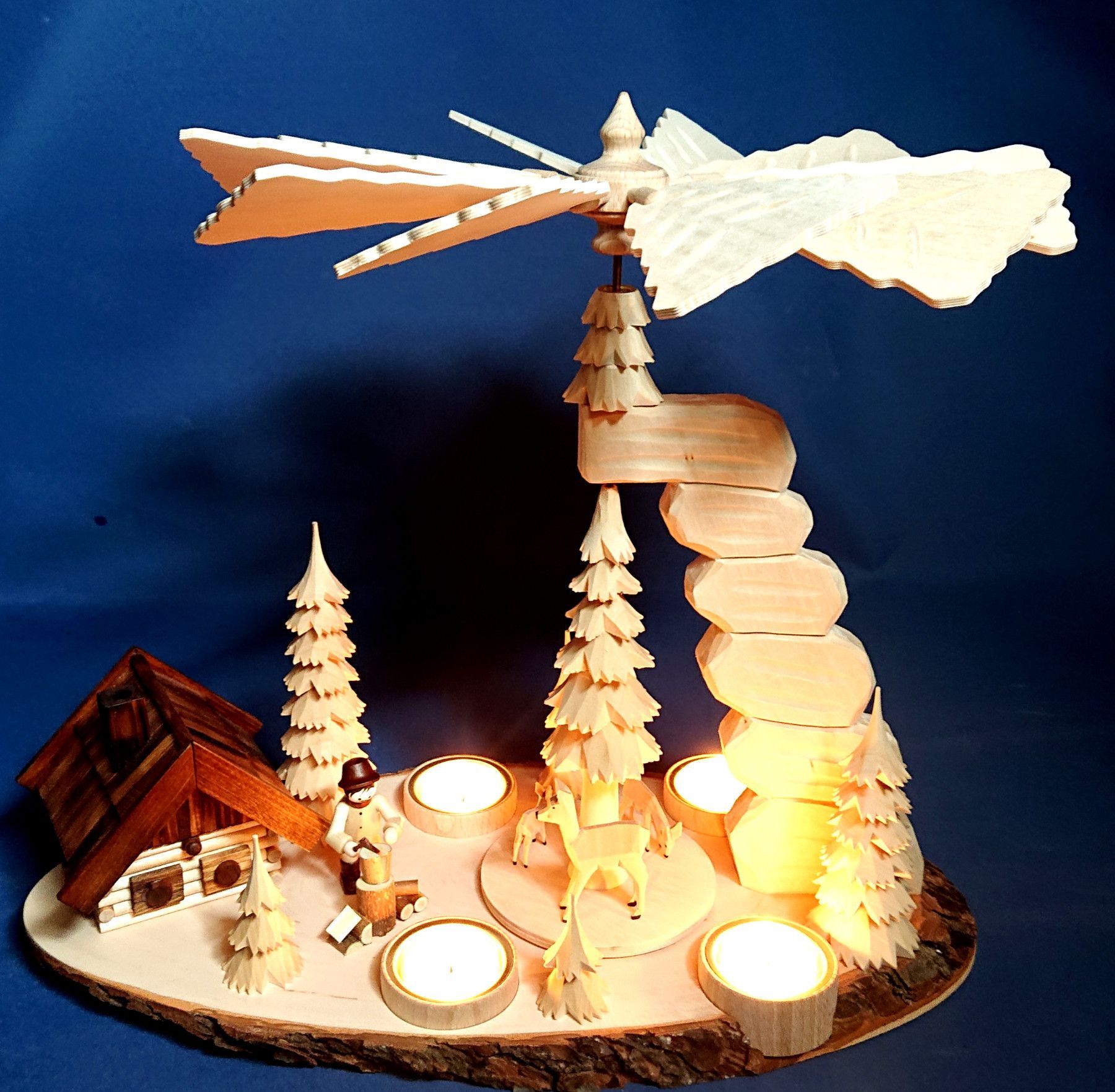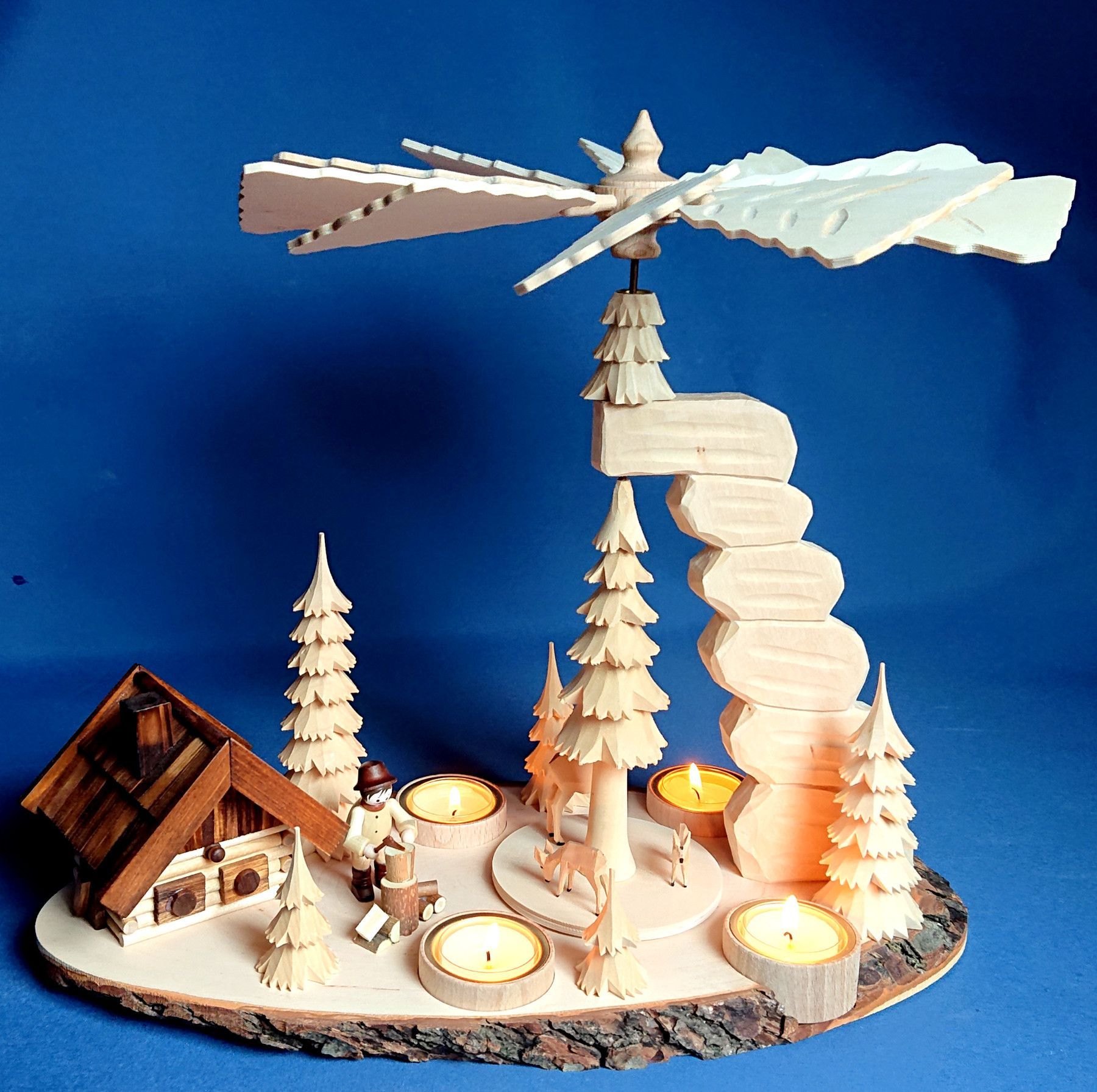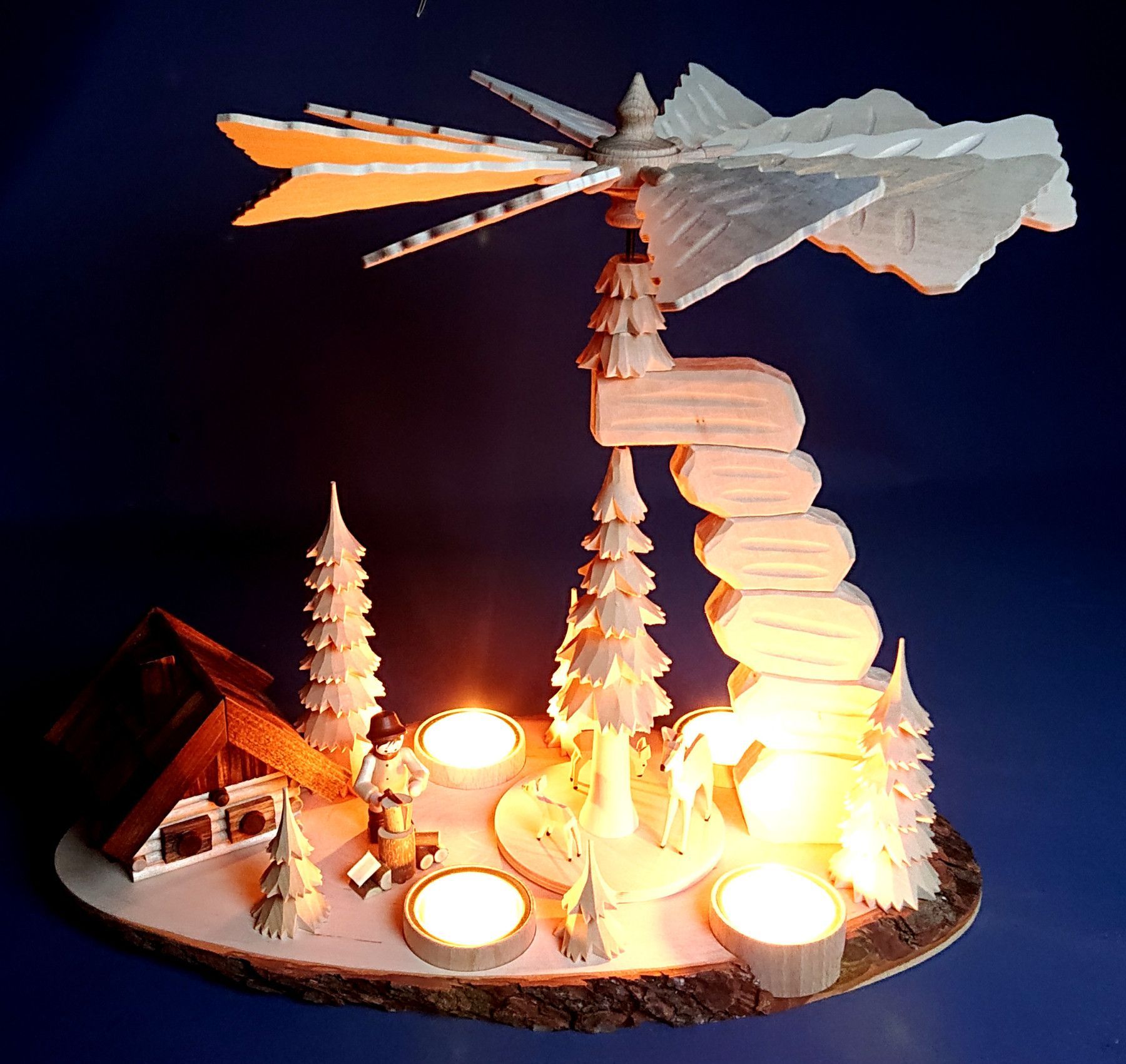 Teelicht Pyramide hand - geschnitzt Waldmotiv Räucherhaus Erzgebirge Schnitzerei