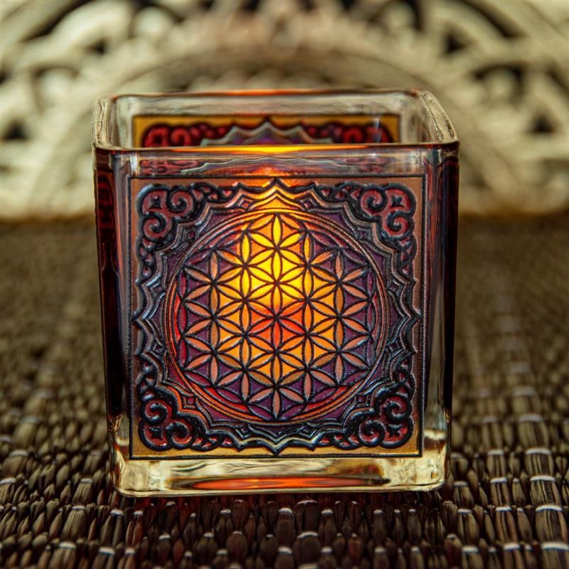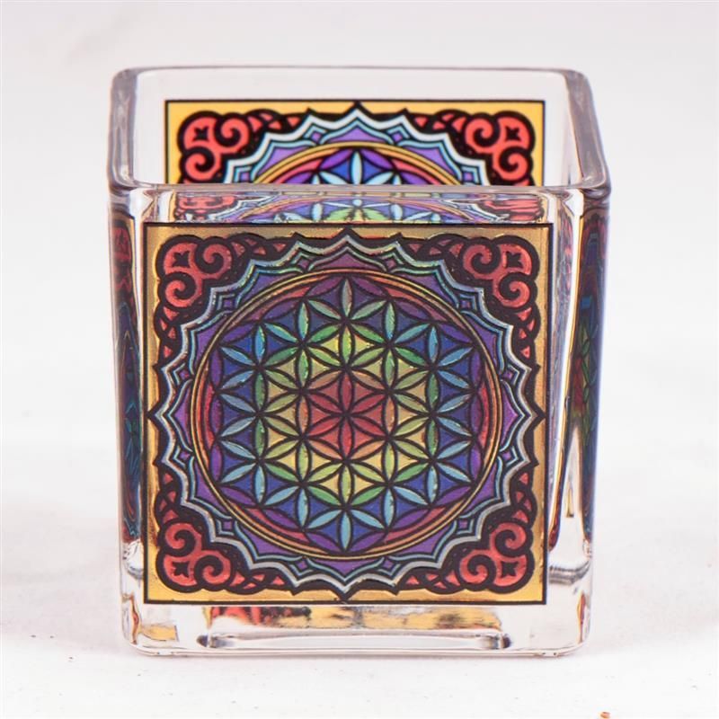 Teelichtglas BLUME DES LEBENS 6 cm Windlicht Kerzenständer Geschenkbox