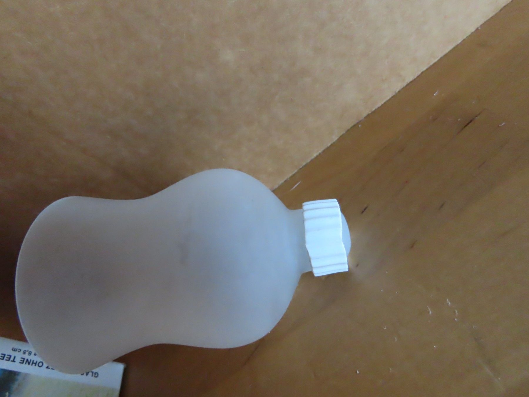 Maße ca. 5,5 cm Durchmesser x 8,5 cm hoch---immer die breiteste Stelle gemessen Innenmaß: ca.6,2 cm hoch x 5 cm Durchmesser mit der Kunststoffmanschette hat sie einen Durchmesser von ca. 2,3 cm Material: Glas ist leicht verschmutzt verstaubt, hat feine Kratzer bin mir nicht sicher ob das der origina