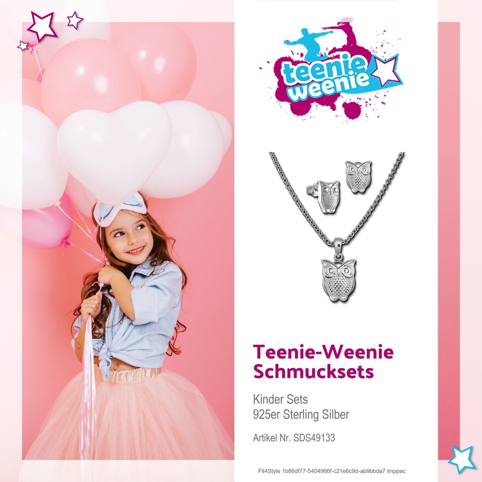 Ein schönes Teenie-Weenie Eule Marken-SET mit der Bestellnummer SDS49133 für Kinder in der Farbe silber. Das bezaubernde 925er Sterling Silber Set besteht aus Kette und Ohrringe und ist aus der Teenie-Weenie Kollektion.