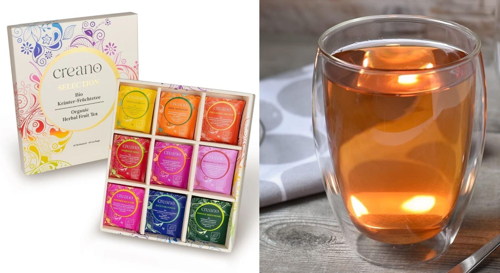 Teeset Creano Geschenkset Bio Früchte Kräutertee 45er + 2x 250ml Thermo Glas