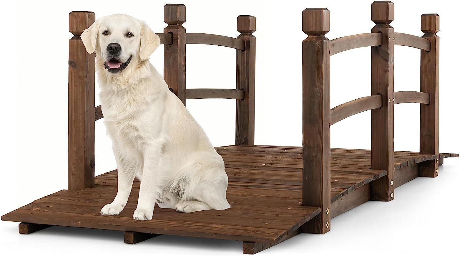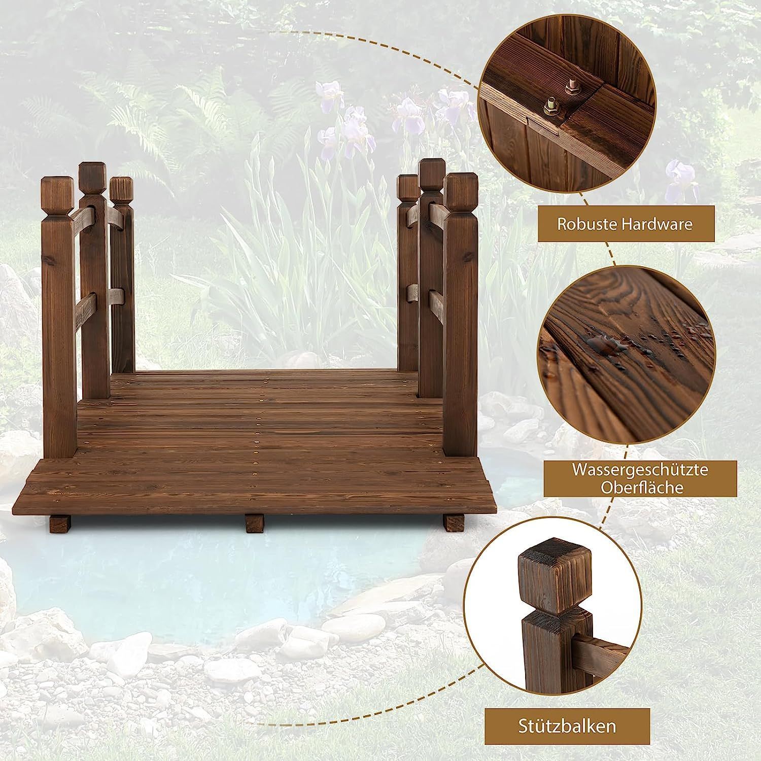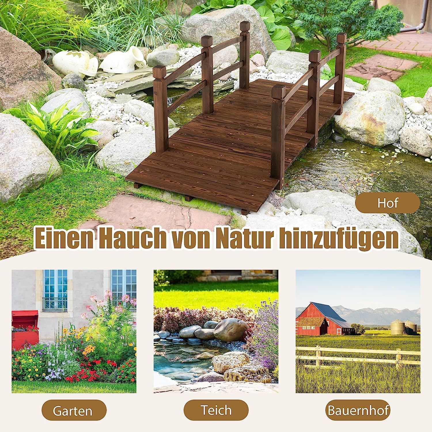 Teichbrücke Gartenbrücke, Holzbrücke mit Geländer, 150 kg belastbar, Dekobrücke