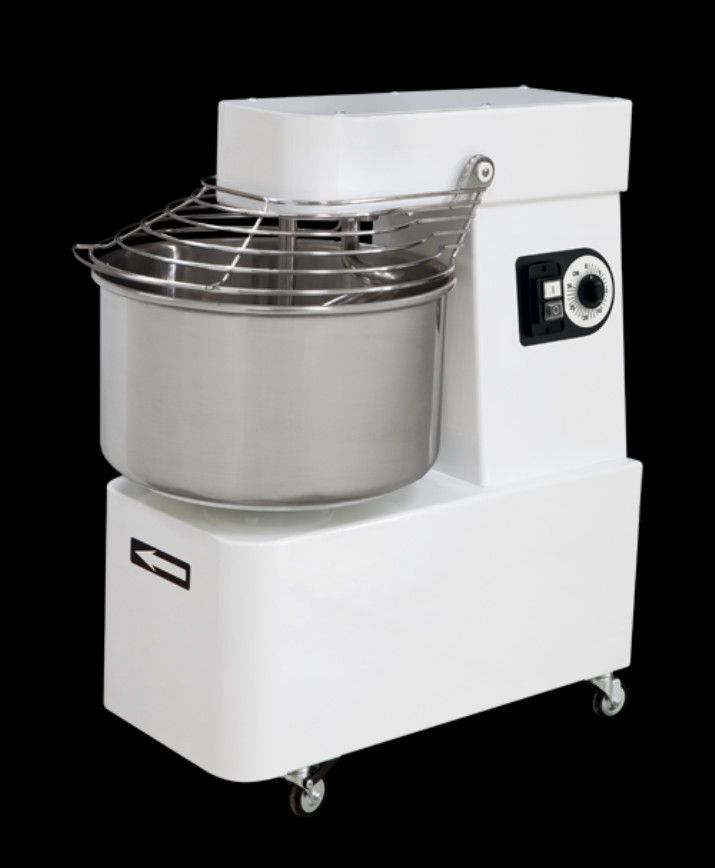 Teigknetmaschine 1 Spiral-Knethaken aus Edelstahl 1 Edelstahlkessel Teigbrecher aus Edelstahl Lenkrollen (2x mit / 2x ohne Bremse) Timer Technische Daten: Maße (BxTxH): 385 x 670 x 725 mm Leistung: 0,75 kW Elektrischer Anschluss: 400 V / 3N / 50 Hz Gewicht: 59 kg