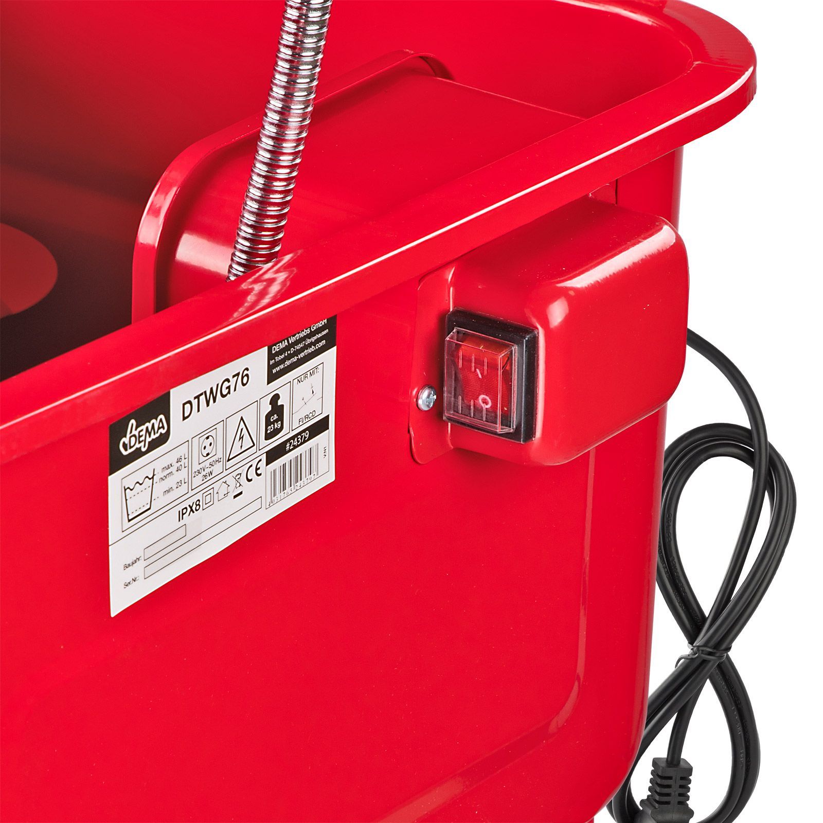 Teilewaschgerät Teilereiniger Teilereinigungsgerät 80 Liter + Pumpe Das DEMA Teilewaschgerät 80 / 3 l/min ist der ideale Helfer für professionelles Reinigen von Teilen und Aggregaten. Mit einer starken Pumpe und flexiblem Metallschlauch reinigt es mühelos verschiedene Arten von Verschmutzungen. Perfekt für Handwerker, Heimwerker, Werkstätten und Industrie. Das Gerät bietet einen sicheren Stand mit vier stabilen Füßen und lässt sich einfach entleeren. Ausgestattet mit einem herausnehmbaren Zwischenboden, einer Wanne für Kleinteile und einem soliden Deckel mit automatischer Hubstütze. Qualität pur! Produktmerkmale Teilewaschgerät Paket: Herausnehmbarer Zwischenboden zum Auflegen der TeileHerausnehmbare Wanne für KleinteileSolider Deckel mit automatischer Hubstütze (schließt bei Feuer automatisch)Elektrische Umwälzpumpe 220 V mit beleuchtetem Ein-/AusschalterFlexibles Strahlrohr mit 60 cm LängeAblageboden unter dem Waschbehälter4 stabile Metallfüße für sicheren StandKomplett aus Stahlblech, lackiertAblassschraube für bequemes EntleerenFür alle gängigen Reinigungsmittel geeignet (sofern für elektrisch betriebene Pumpen zugelassen und Flammpunkt > 65°C) WARNUNG!Nicht ohne Sicherung oder mit falschen Reinigungsmitteln verwenden!Gefahr von Verletzungen und schweren Schäden am Gerät!Betrieb nur mit Schutzschalter (FI) und ohne die Nutzung von Waschbenzin! Technische DatenVolumen: 80 LiterMaße Nutzraum: 71x48x26 cmMaße Wanne LxBxH: 24,5x15x8,5 cmZwischenboden LxB: 47x47 cmAblageboden LxB: 68x42 cmFördermenge: ca. 3 Liter / MinuteFüllmenge Reinigungsflüssigkeit: max 50 LiterEigengewicht: ca. 24 kgMaße Gesamtabmessungen LxBxH: 78x54x88 cm