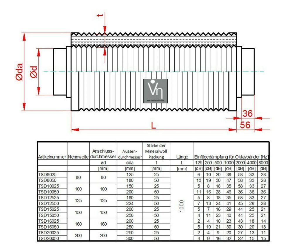 Telefonie Schalldämpfer 80 100 125 150 160 180 200 Rohr Lüftung 1000mm lang TSDD