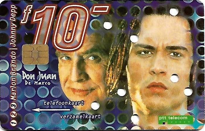 Telefonkarte Niederlande , f 10,- , zum Film: Don Juan de Marco , leer , spezielle Lochungen auf der Karte (siehe Abb.) , gebraucht Chip-Karte., leer