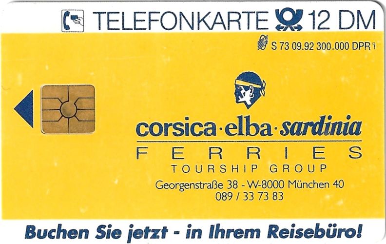 Telefonkarte - S 73 von 1992 , Sardinia Ferries , gebraucht, leere 12,- DM Karte Auflage 300.000