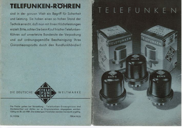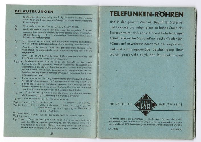 Telefunken Röhren, Angebotskatalog mit Preisliste anno 1939,