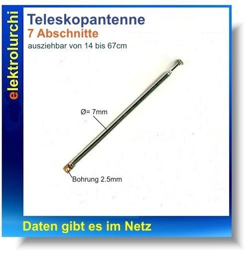 Sie bieten hier auf folgende Artikel NEU 1 Stück Teleskopantenne mit Gelenk 7-Abschnitte ausziehbar 14-67cm für TV Radio Funkamateur Für Radios, Spielzeuge, TV, Radio, ferngesteuerte Fahrzeuge, Instrumente, Funksignale ect. Aufführung: Teleskopantenne Abschnitte: 7 Material: Edelstahl Volle gestreck