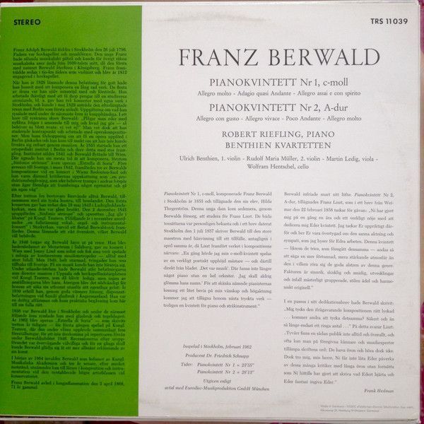 Telestar TRS 11 039 - Franz Berwald, Benthien Quartet, Robert Riefling - Pianokv