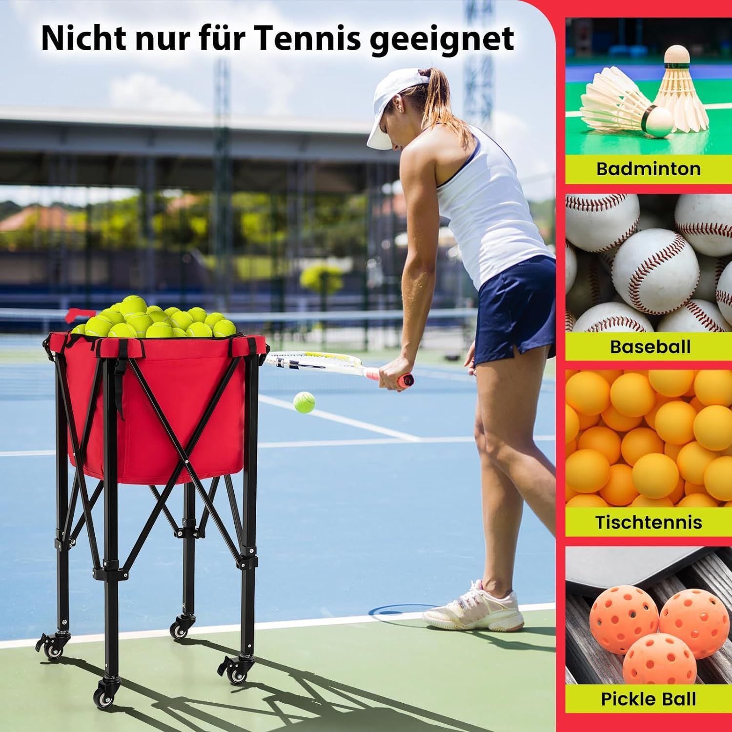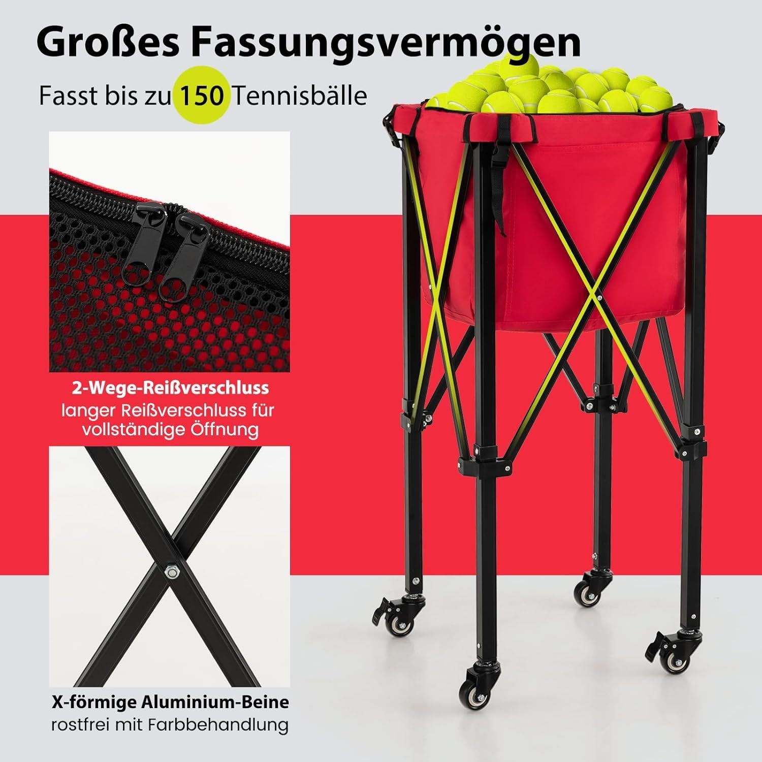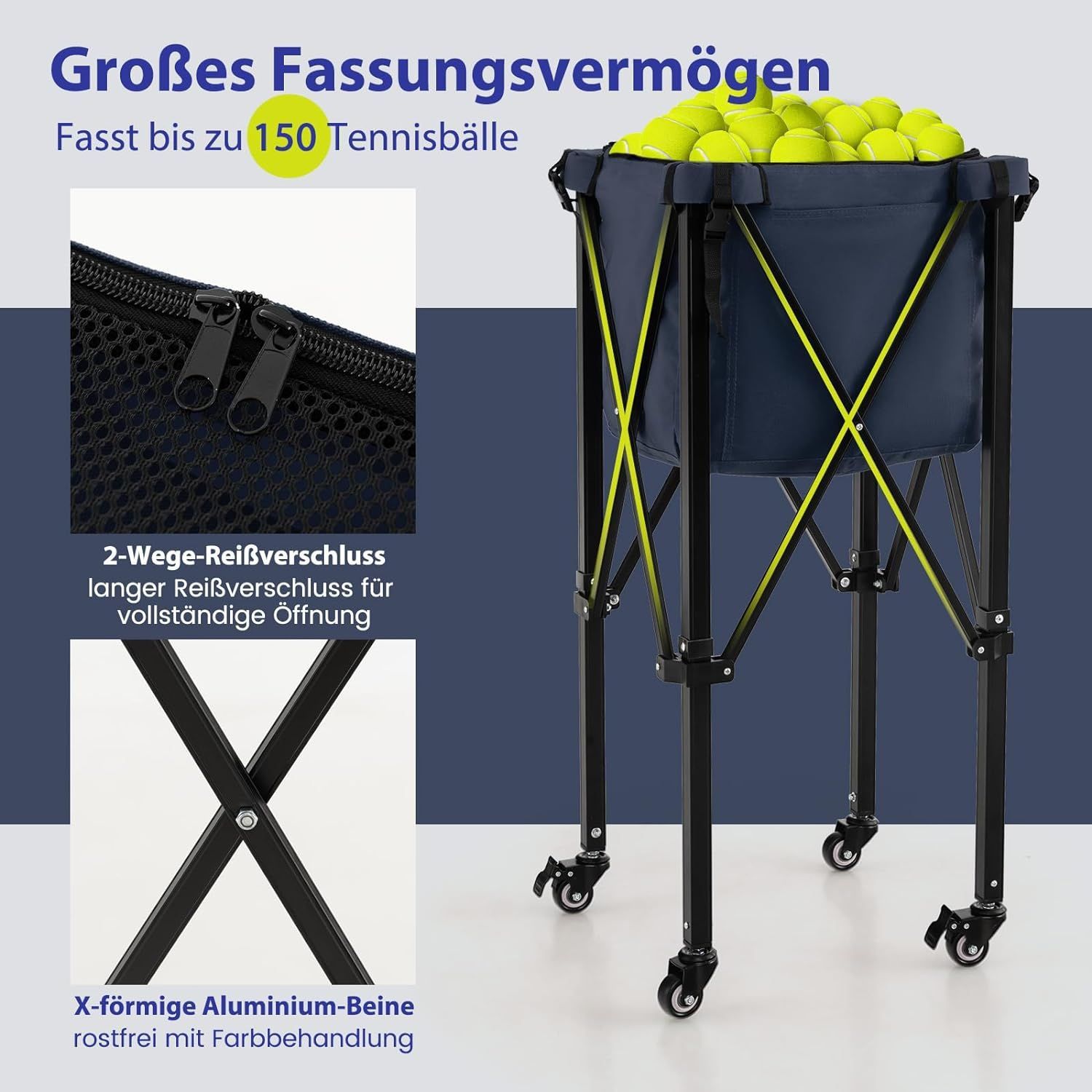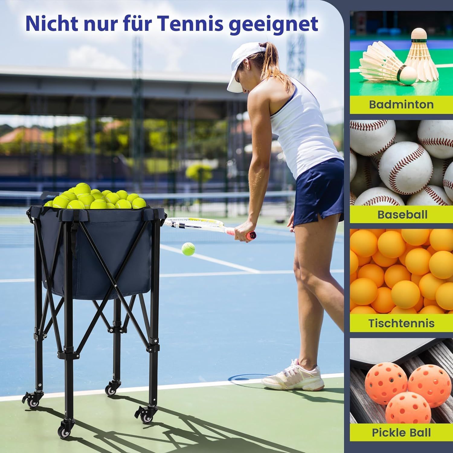 Tennisballwagen klappbar, Leichter Tennisballkorb mit Rädern, Seitentasche, bis 30 kg